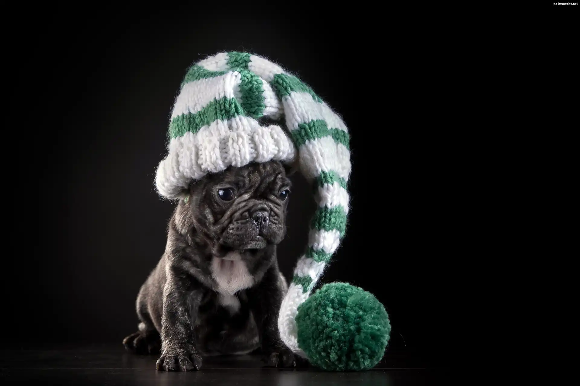 Pies, Pompon, Dzianina, Buldog francuski, Szczeniak, Zimowa, Czapka na Komórkę