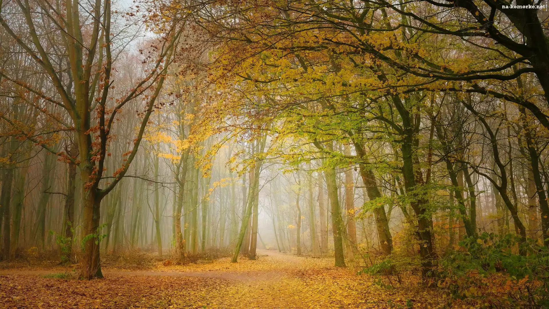 Mgła, Jesień, Liście, Poranek, Drzewa, Las na Komórkę