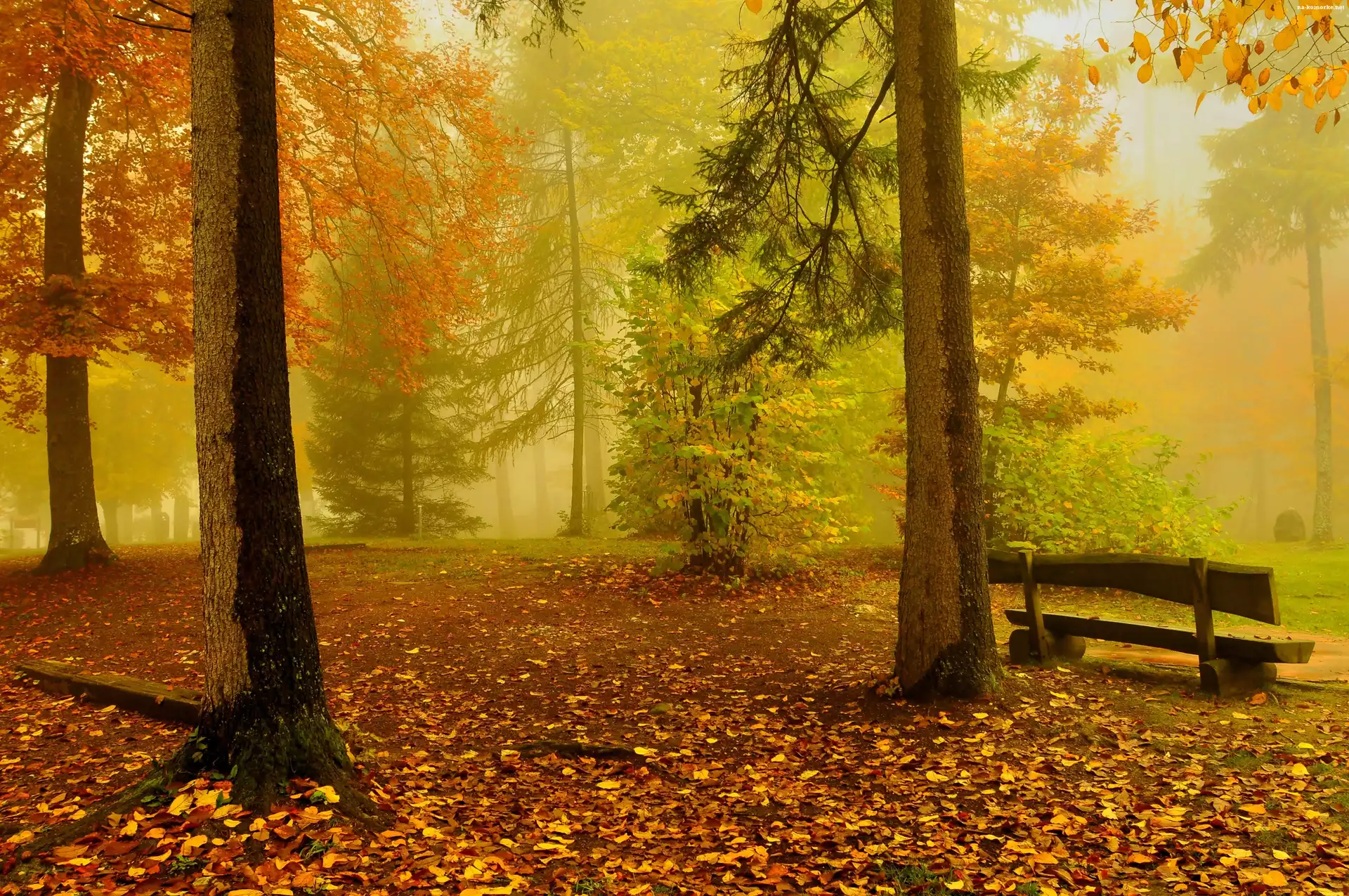 Las, Poranek, Jesień, Drzewa, Liście, Ławka, Mgła na Komórkę