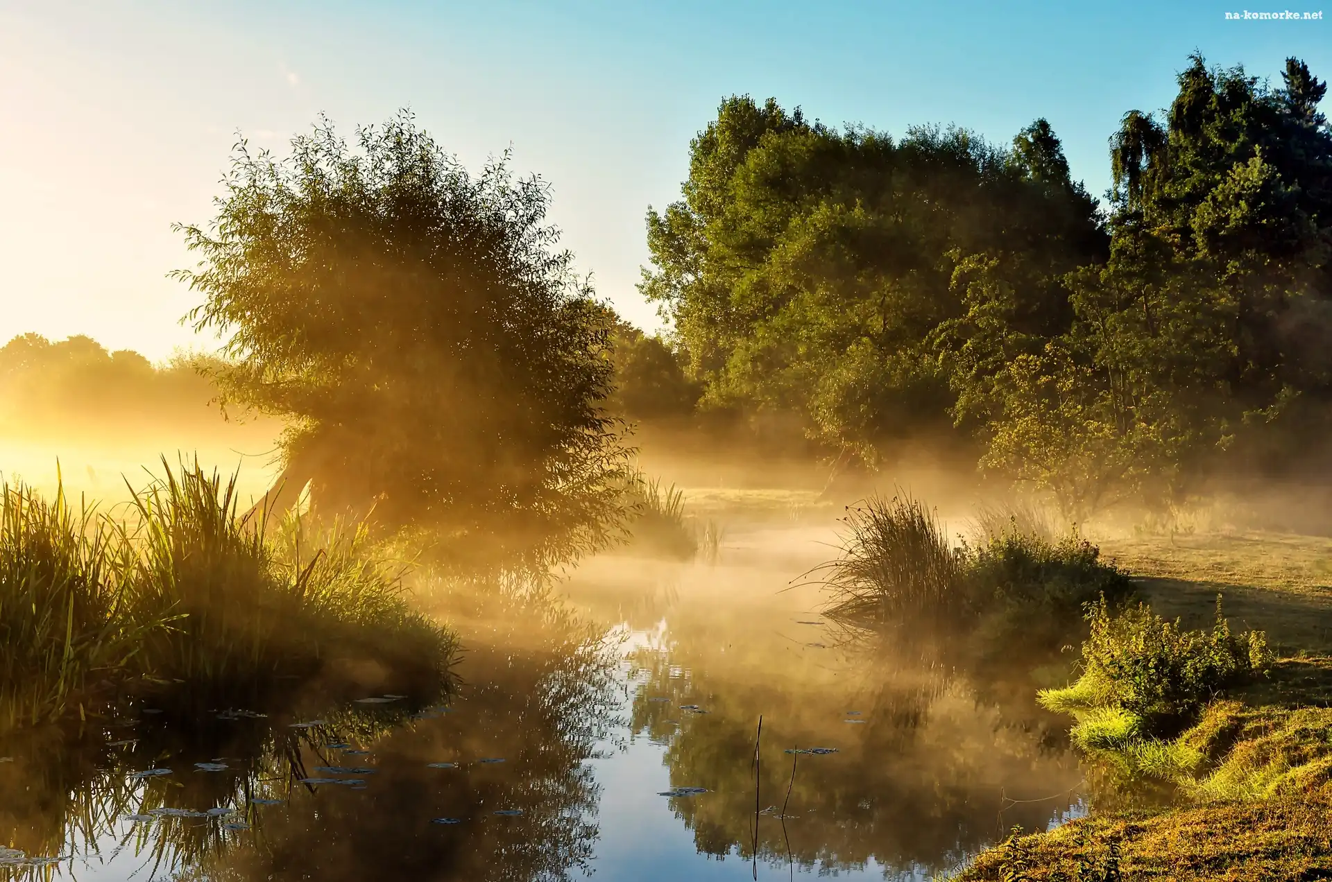 Poranek, Drzewa, Mgła, Woda na Komórkę