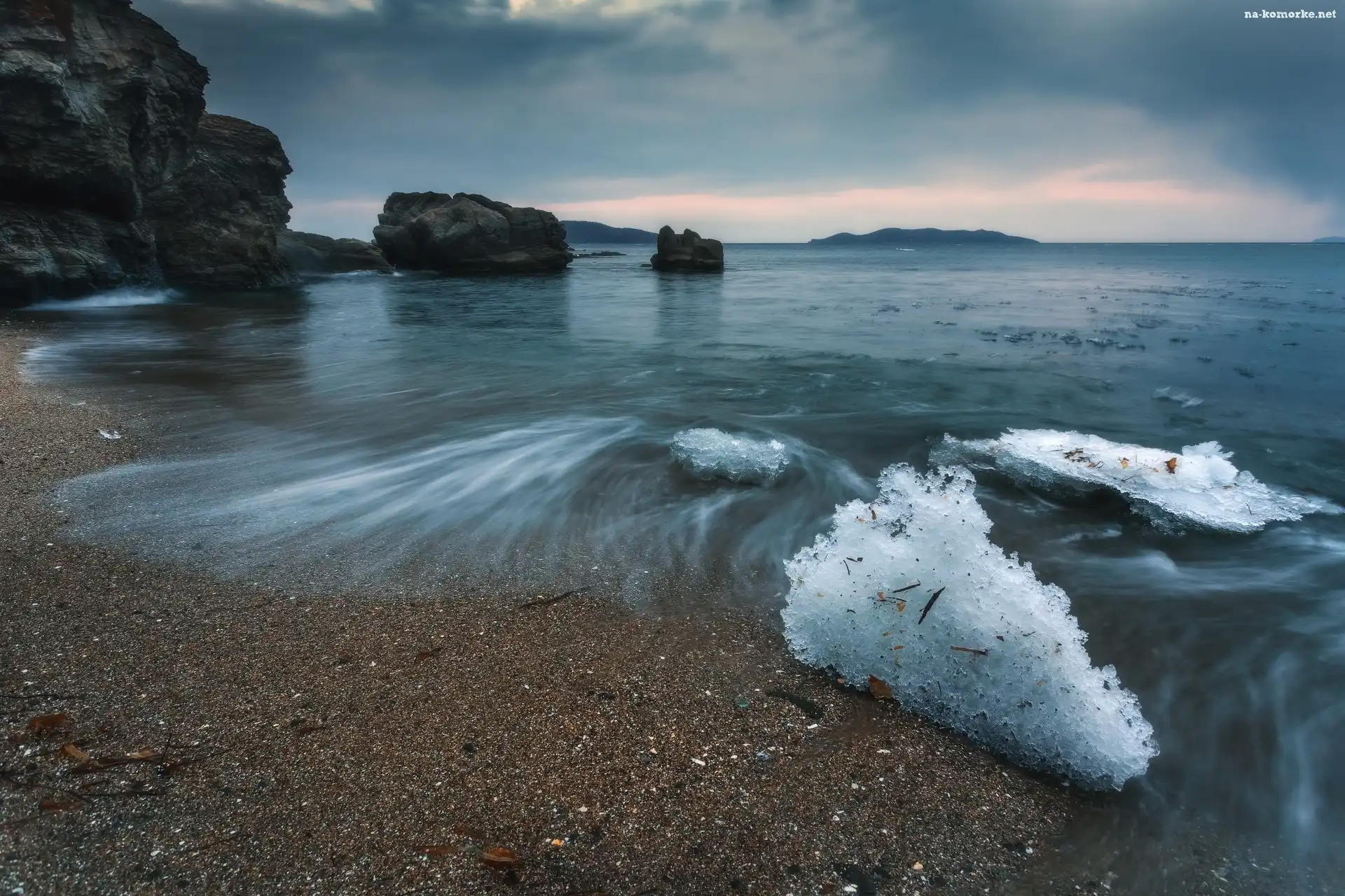 Śnieg, Morze, Skały, Poranek, Brzeg na Komórkę