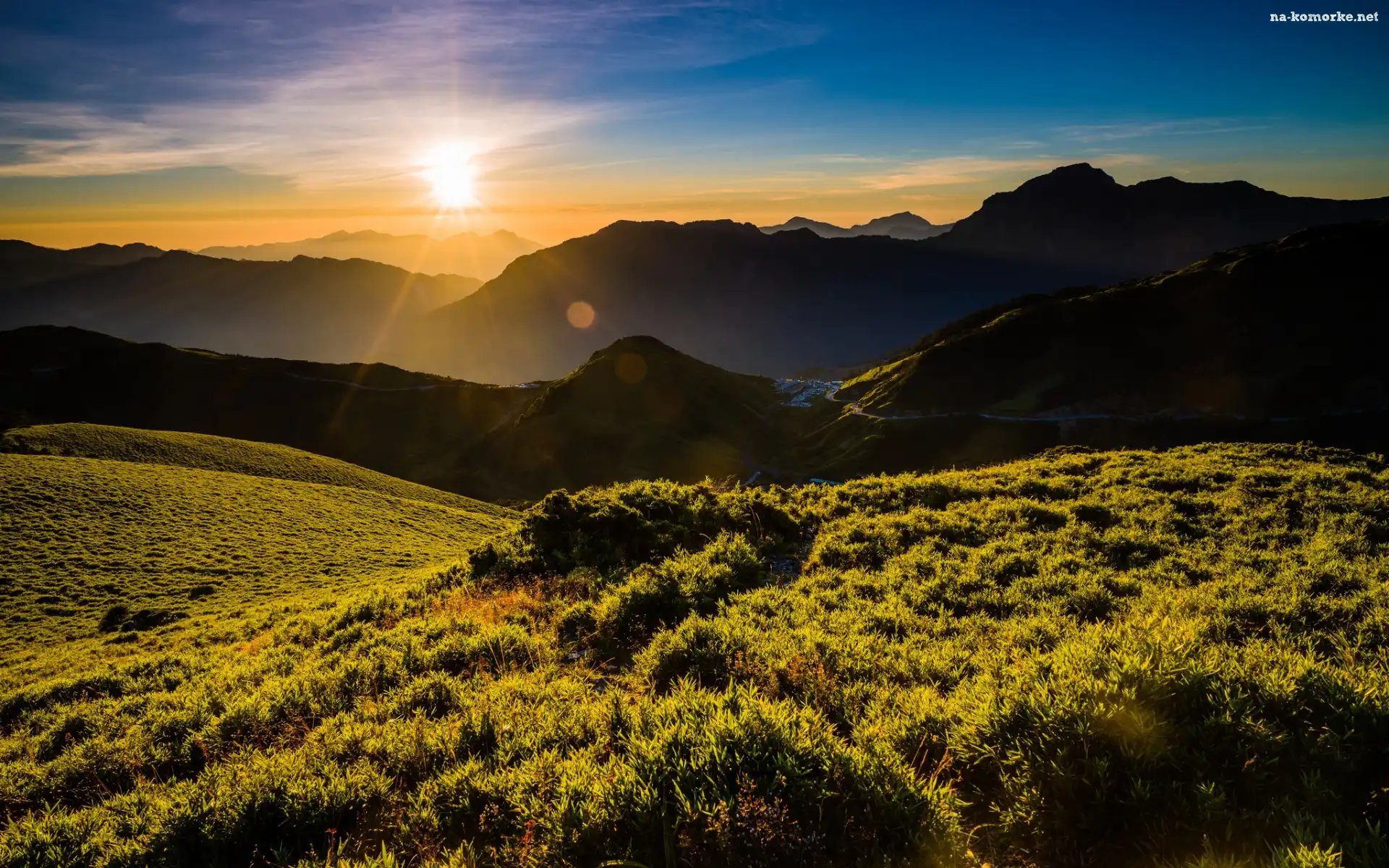 Góry, Chmury, Zarośla, Wschód słońca, Lasy, Trawa, Promienie słoneczne, Poranek na Komórkę