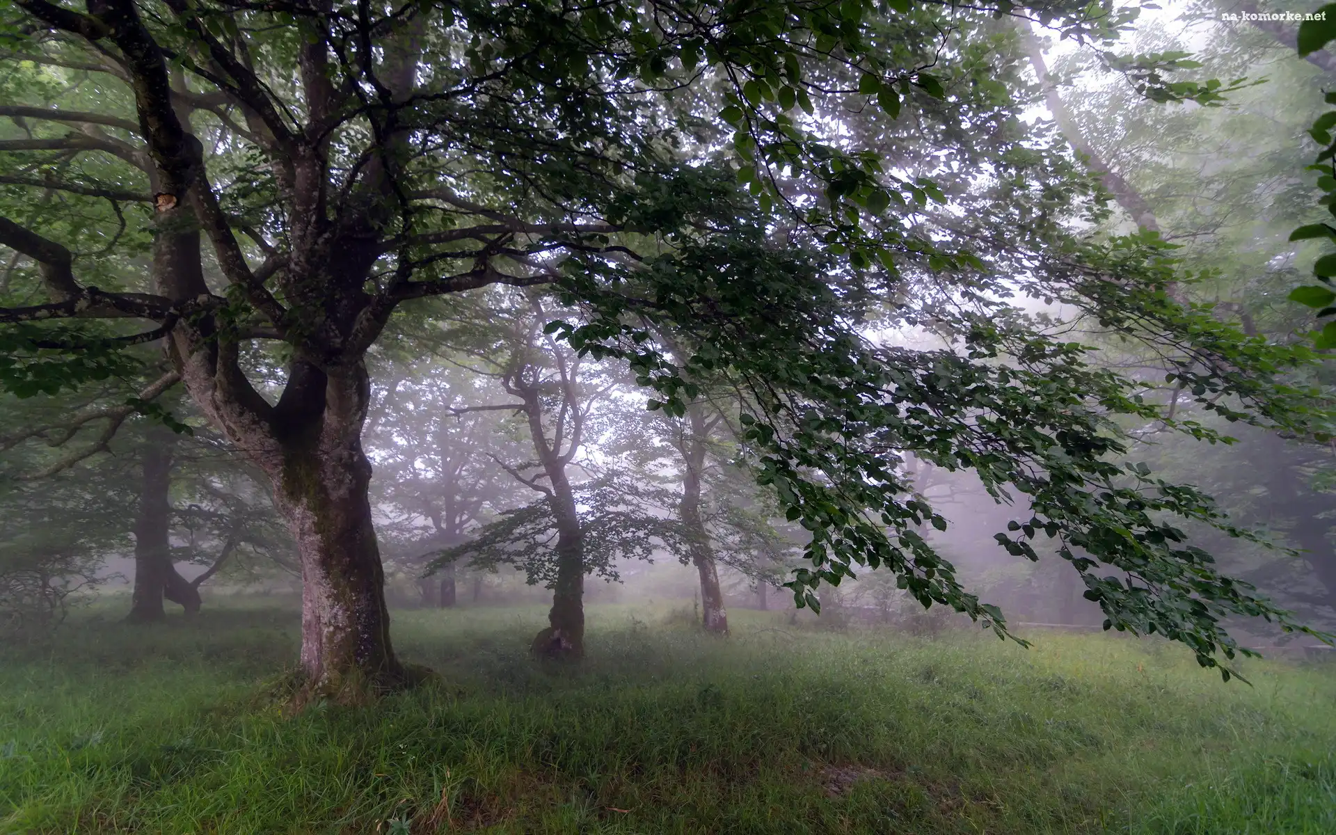 Poranek, Las, Drzewa, Trawa, Mgła na Komórkę