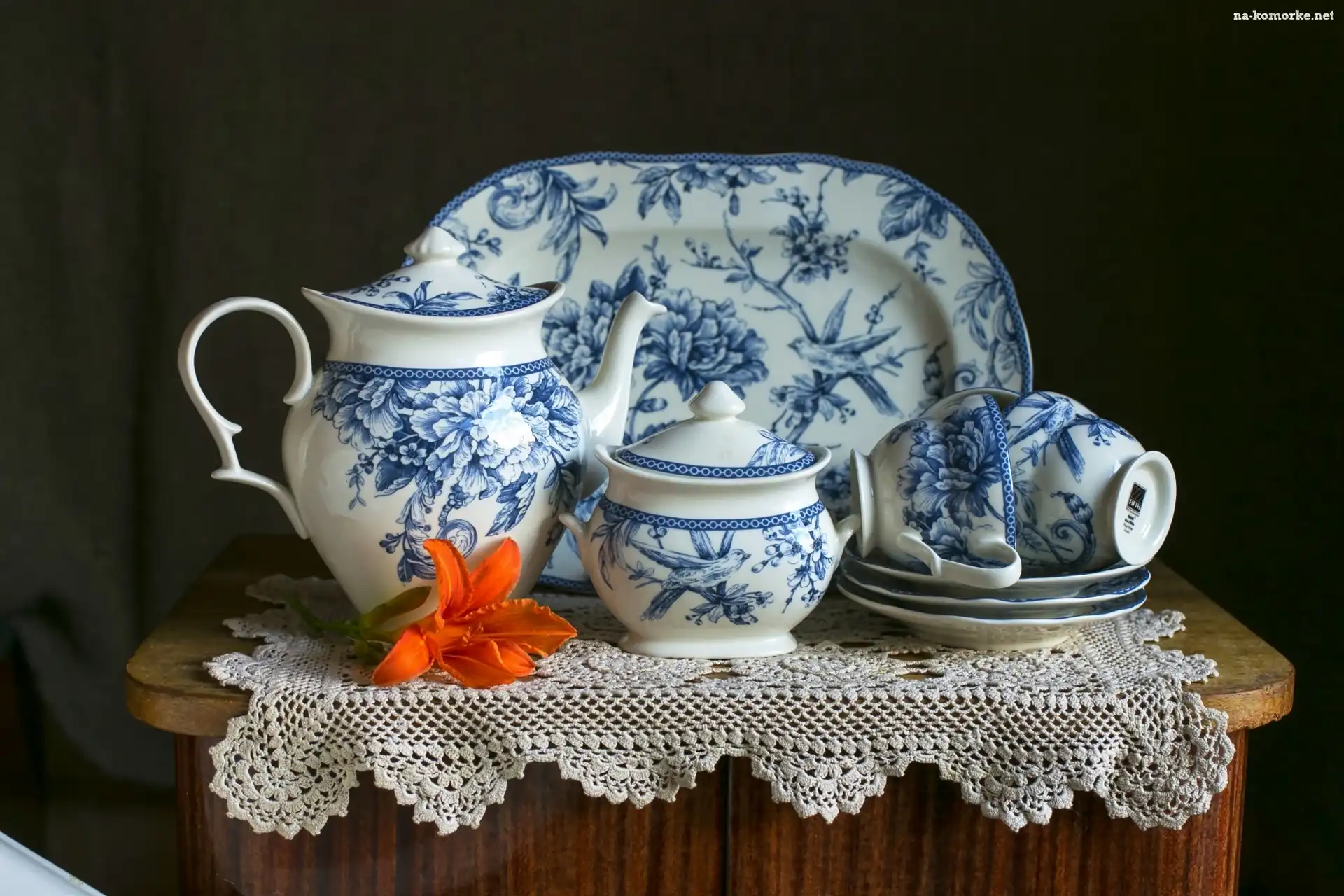 Talerzyki, Dzbanek, Cukiernica, Serweta, Porcelana, Szydełkowa, Półmisek, Kwiat, Pomarańczowy, Filiżanki, Niebieski, Wzór, Adelaide Blue na Komórkę |
