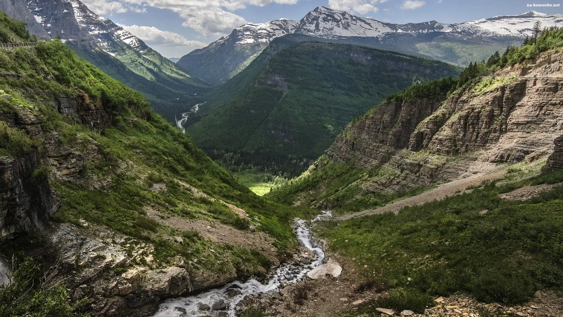 Porośnięte, Przełęcz Logan Pass, Stany Zjednoczone, Góry Skaliste, Stan Montana, Park Narodowy Glacier, Wzgórza, Skały, Strumyk, Kamienie na Komórkę |