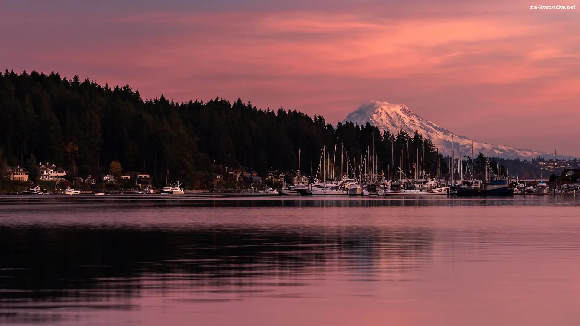 Port, Zatoka Gig Harbor, Jezioro, Przystań, Stany Zjednoczone, Mount Rainier, Zachód słońca, Żaglówki, Stan Waszyngton, Góra, Drzewa na Komórkę |