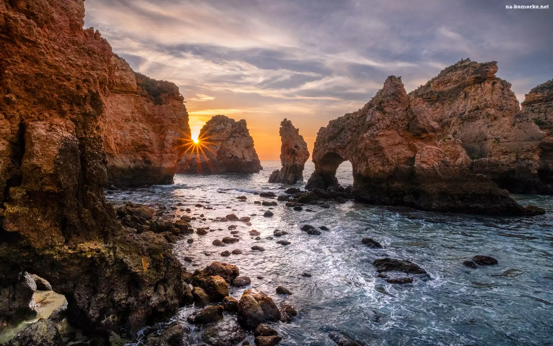 Ponta da Piedade, Region Algarve, Wybrzeże, Portugalia, Morze, Wschód słońca, Skały na Komórkę