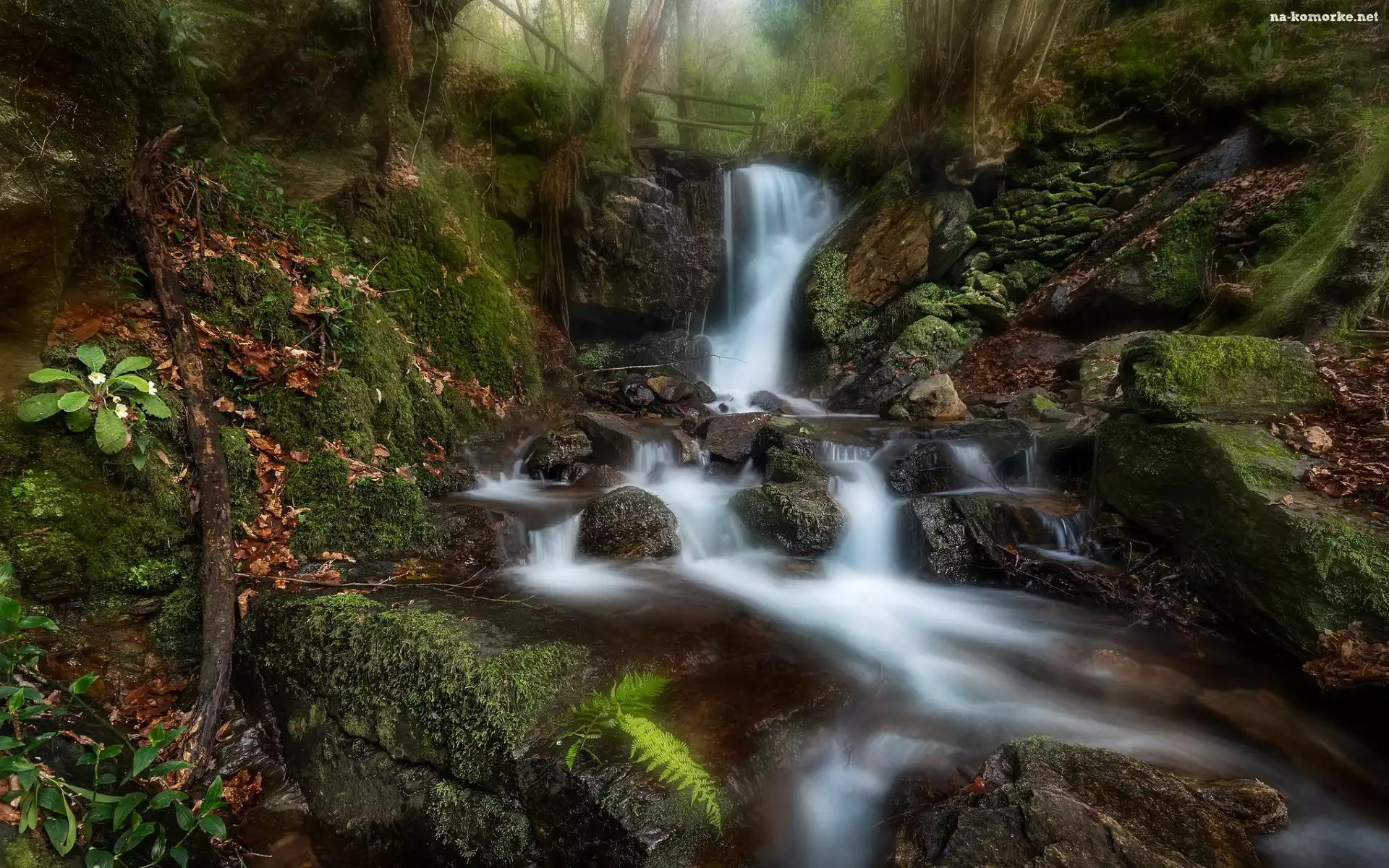 Portugalia, Las, Wodospad Cabreia, Gmina Sever do Vouga, Drzewa, Kamienie, Drewniany, Kaskada, Mostek, Omszałe, Skały na Komórkę |