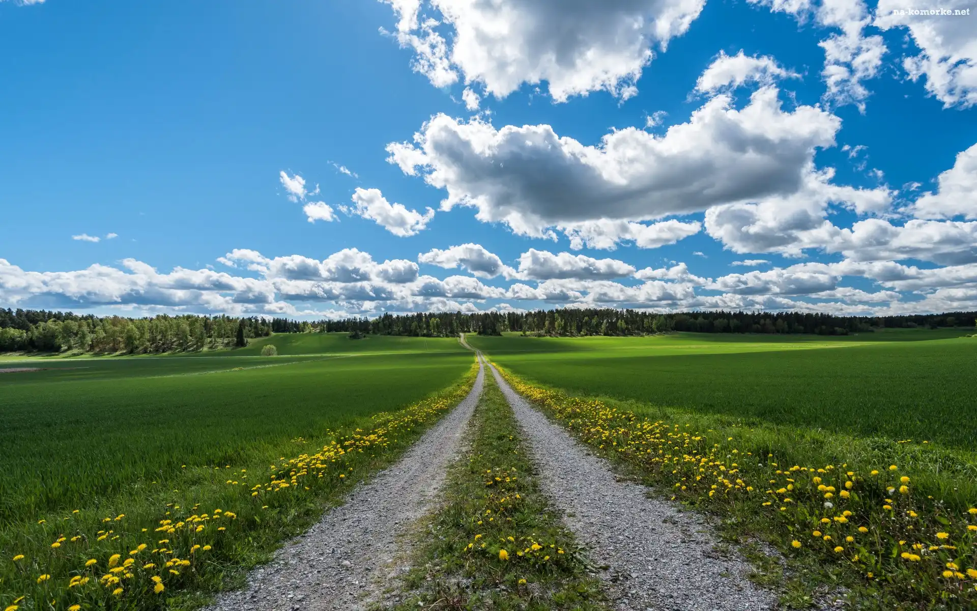 Mniszek pospolity, Łąka, Droga, Niebo, Kwiaty, Chmury na Komórkę