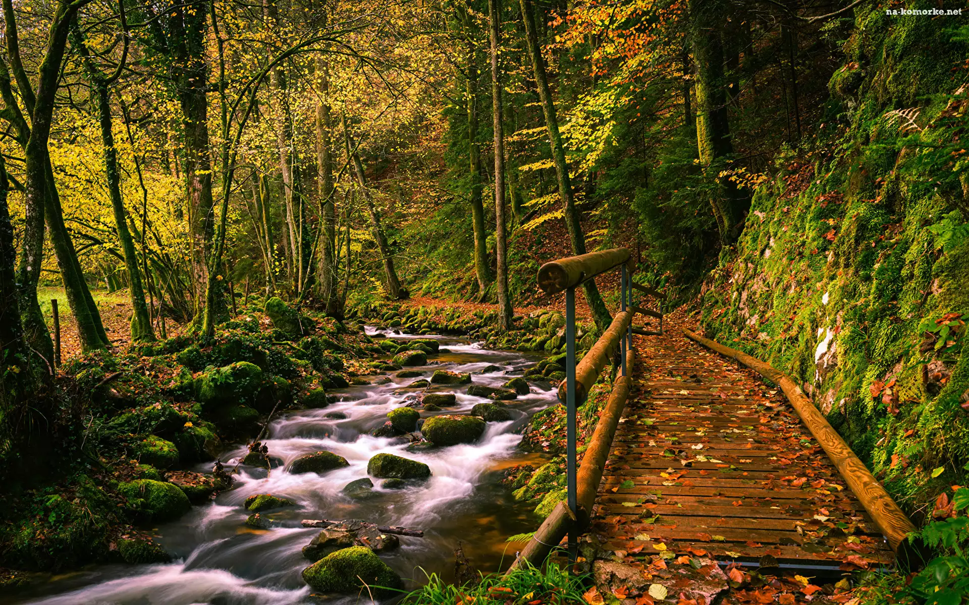 Potok, Drzewa, Las, Pomost, Rzeczka, Kamienie na Komórkę
