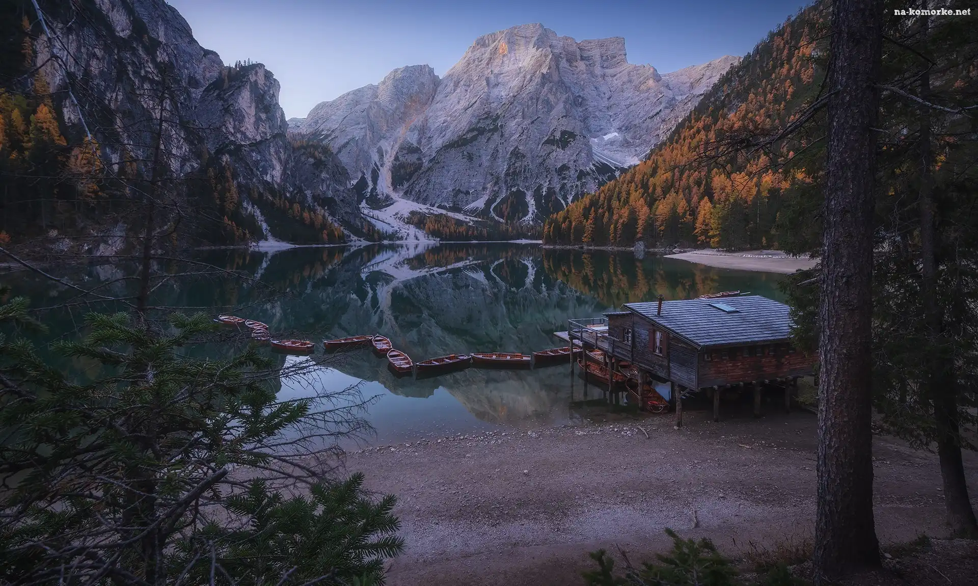 Łódki, Domek, Południowy Tyrol, Drewniany, Jezioro Pragser Wildsee, Włochy, Góry Dolomity, Pomost, Lago di Braies, Drzewa na Komórkę |