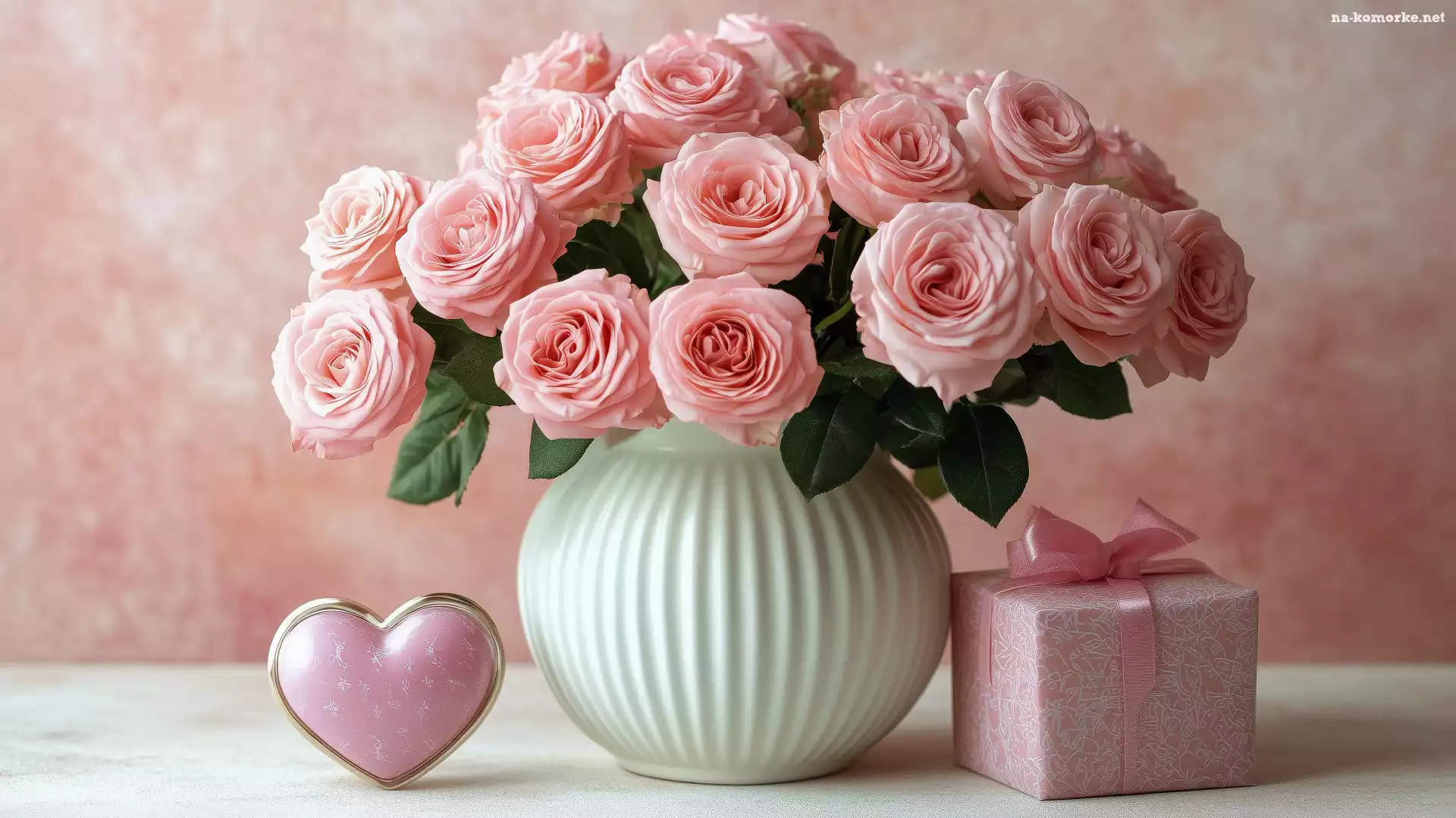 Wazon, Serce, Kwiaty, Prezent, Róże, Bukiet, Jasnoróżowe na Komórkę