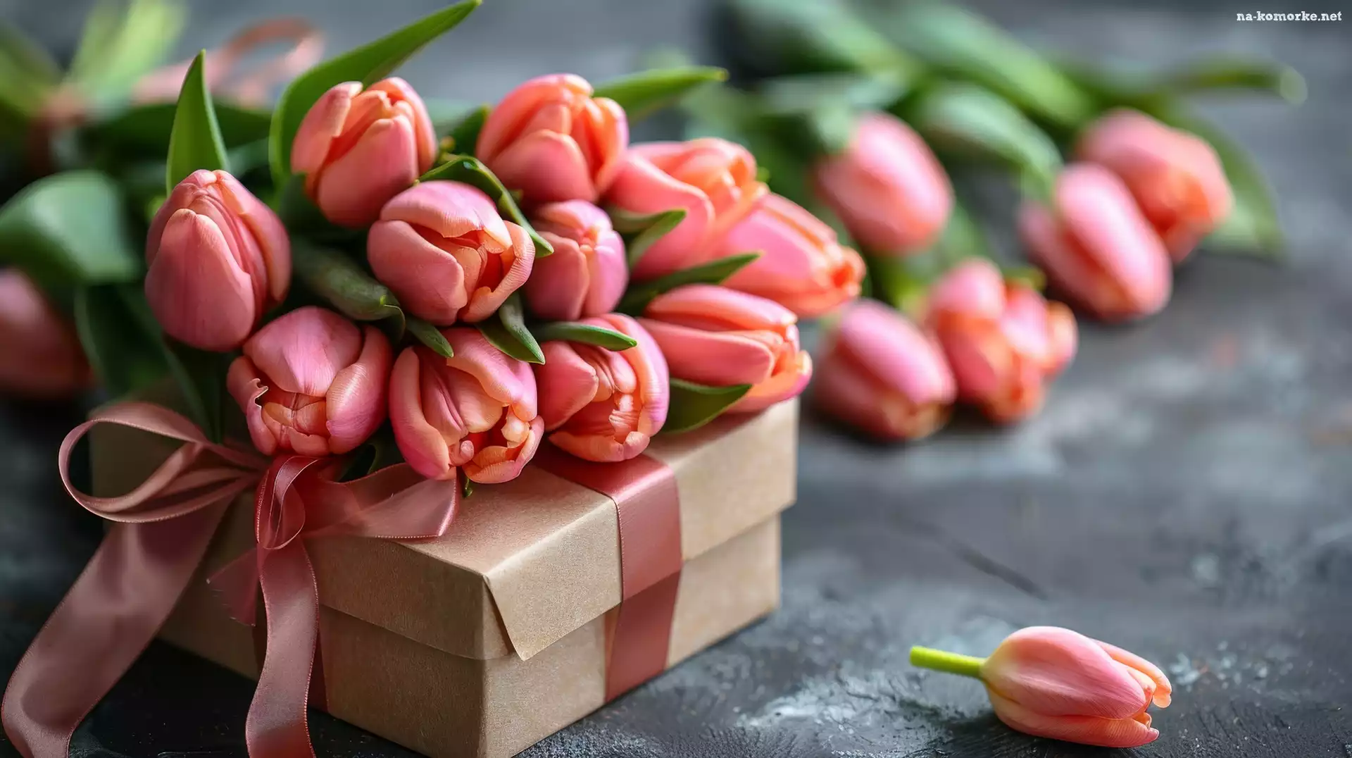 Bukiet, Prezent, Wstążka, Tulipany, Kokarda na Komórkę