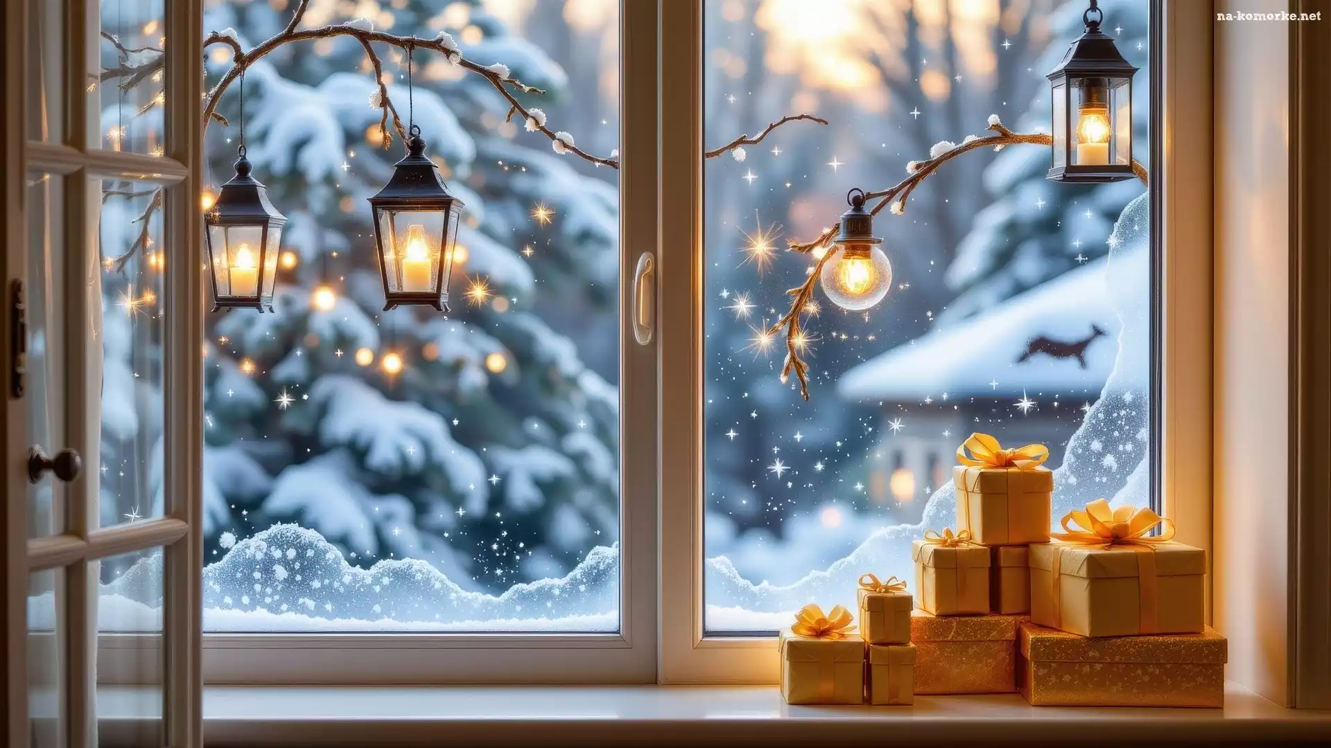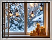 Okno, Prezenty, Lampiony, Zima, Gałązki na Komórkę