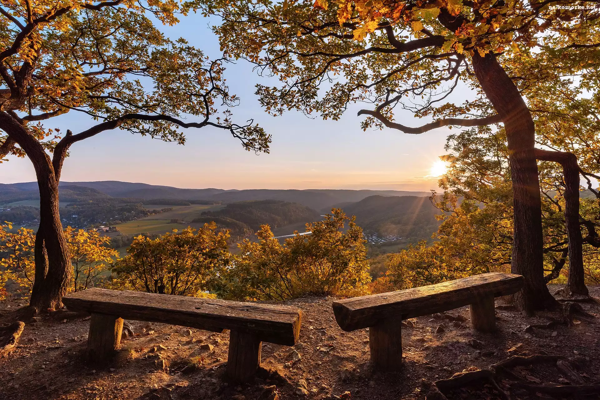Promienie słońca, Jesień, Drzewa, Ławki, Wzgórze na Komórkę