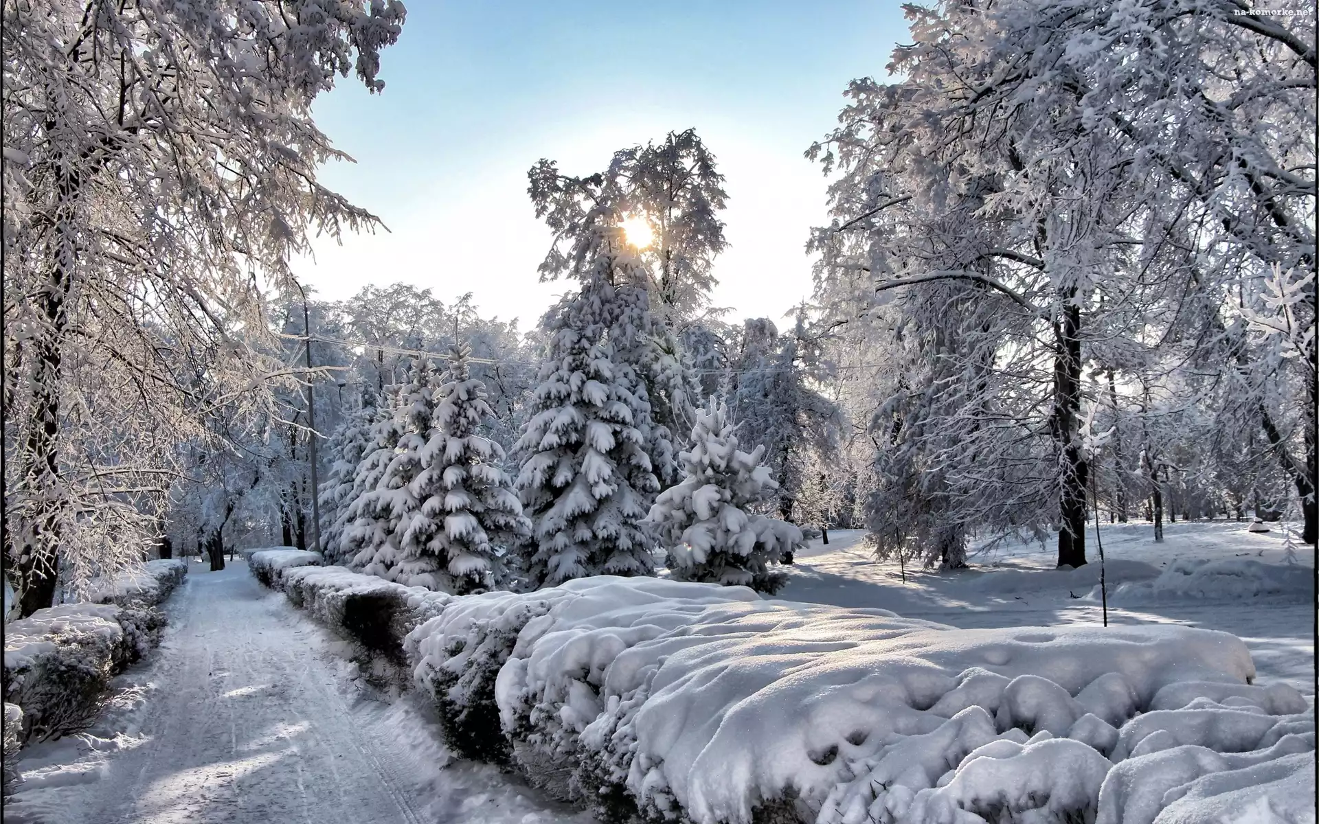Promienie, Alejki, Park, Zima, Drzewa, Słońca na Komórkę