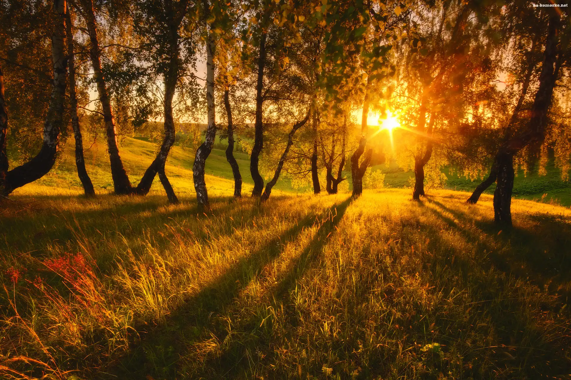 Promienie słońca, Trawa, Drzewa, Brzozy na Komórkę