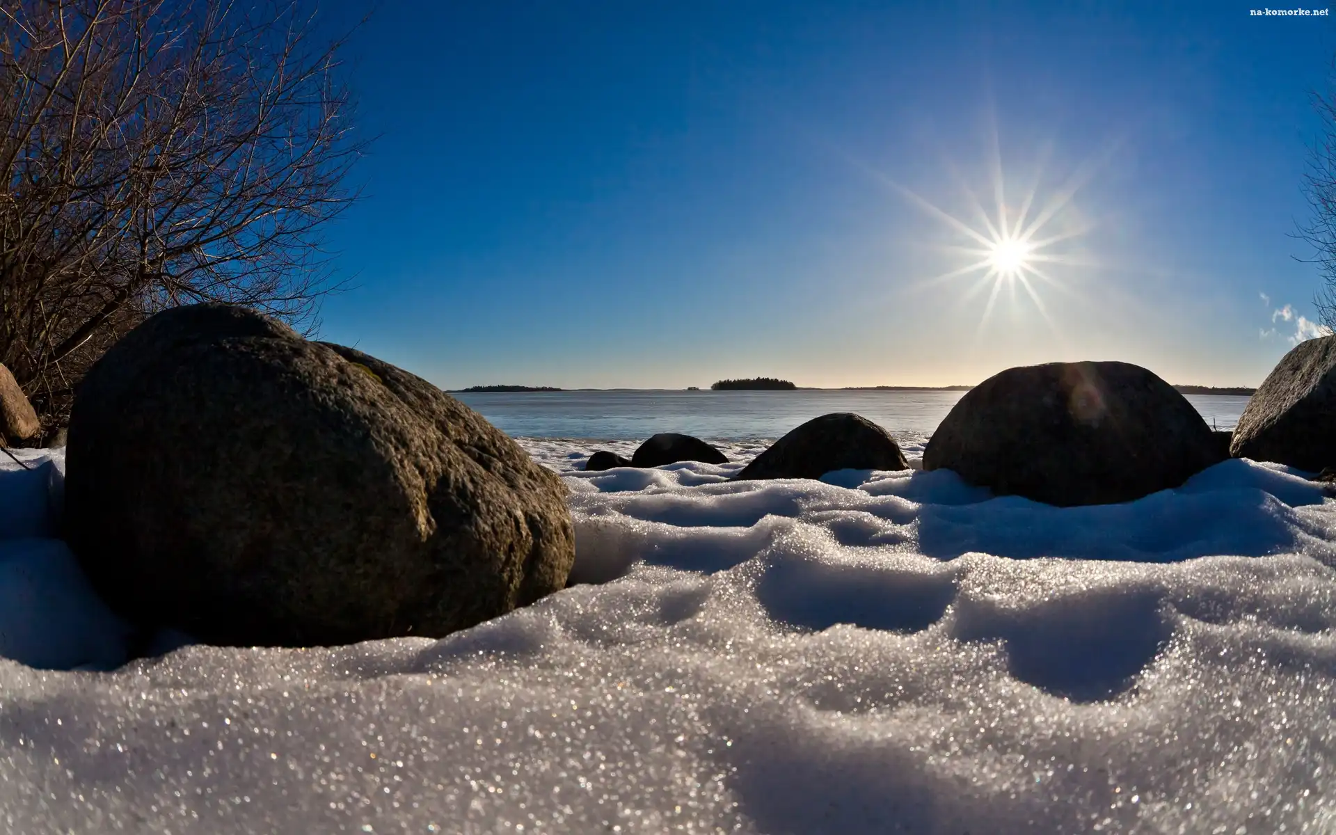 Promienie Słońca, Zima, Zamarznięte, Jezioro, Kamienie na Komórkę