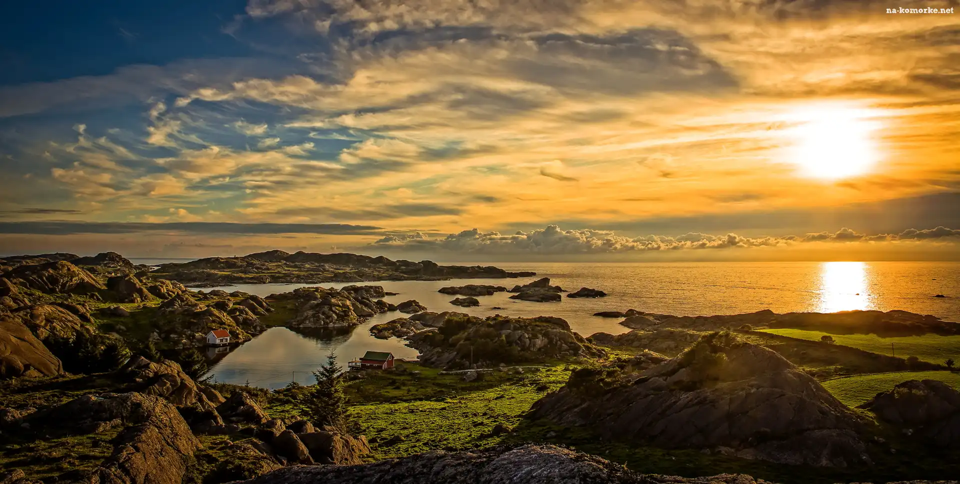 Morze, Promienie, Słońca, Skały, Domy, Zatoka, Chmury na Komórkę