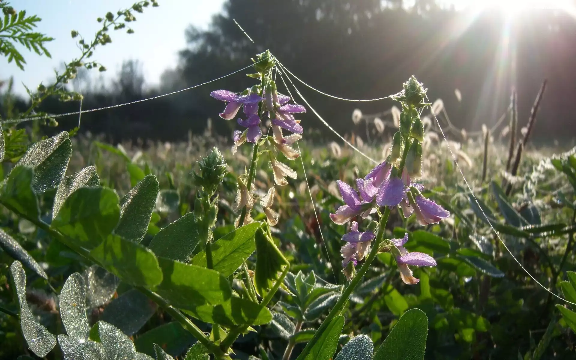 Promienie, Fioletowe, Kwiaty, Rosa, Pajęczyna na Komórkę