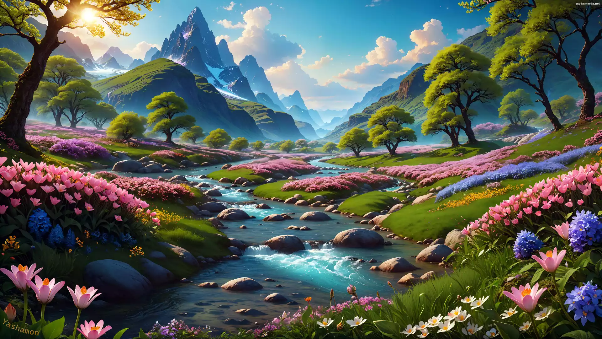 Promienie słońca, Kwiaty, Wiosna, Drzewa, Kamienie, Potok, Góry, Trawa, Niebo na Komórkę