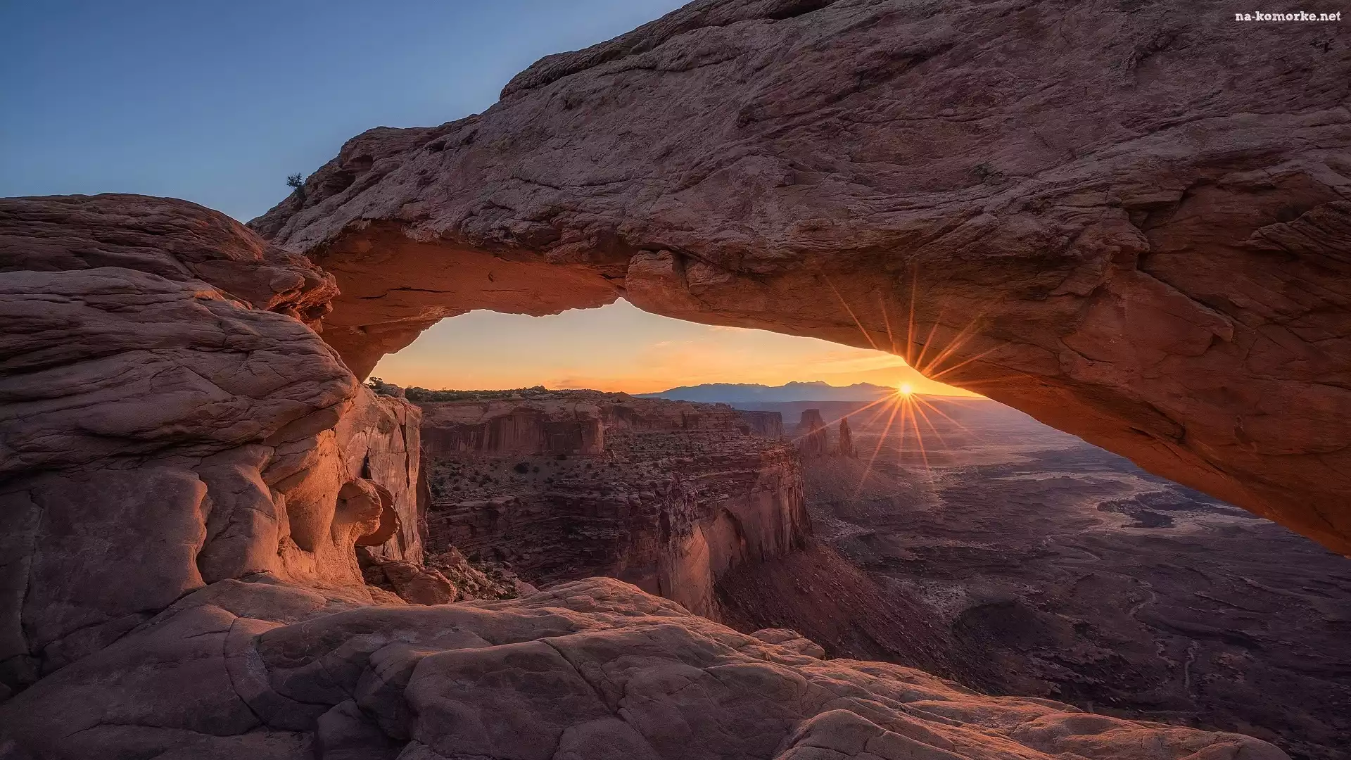 Łuk, Utah, Kanion, Promienie słońca, Park Narodowy Canyonlands, Stany Zjednoczone, Mesa Arch, Skały na Komórkę |