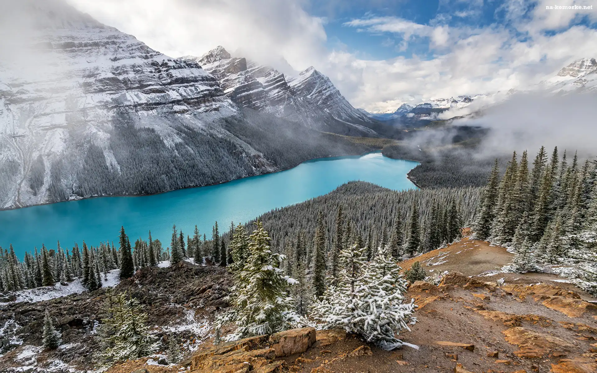 Zima, Jezioro, Kanada, Góry, Prowincja Alberta, Śnieg, Park Narodowy Banff, Peyto Lake, Chmury, Drzewa na Komórkę |