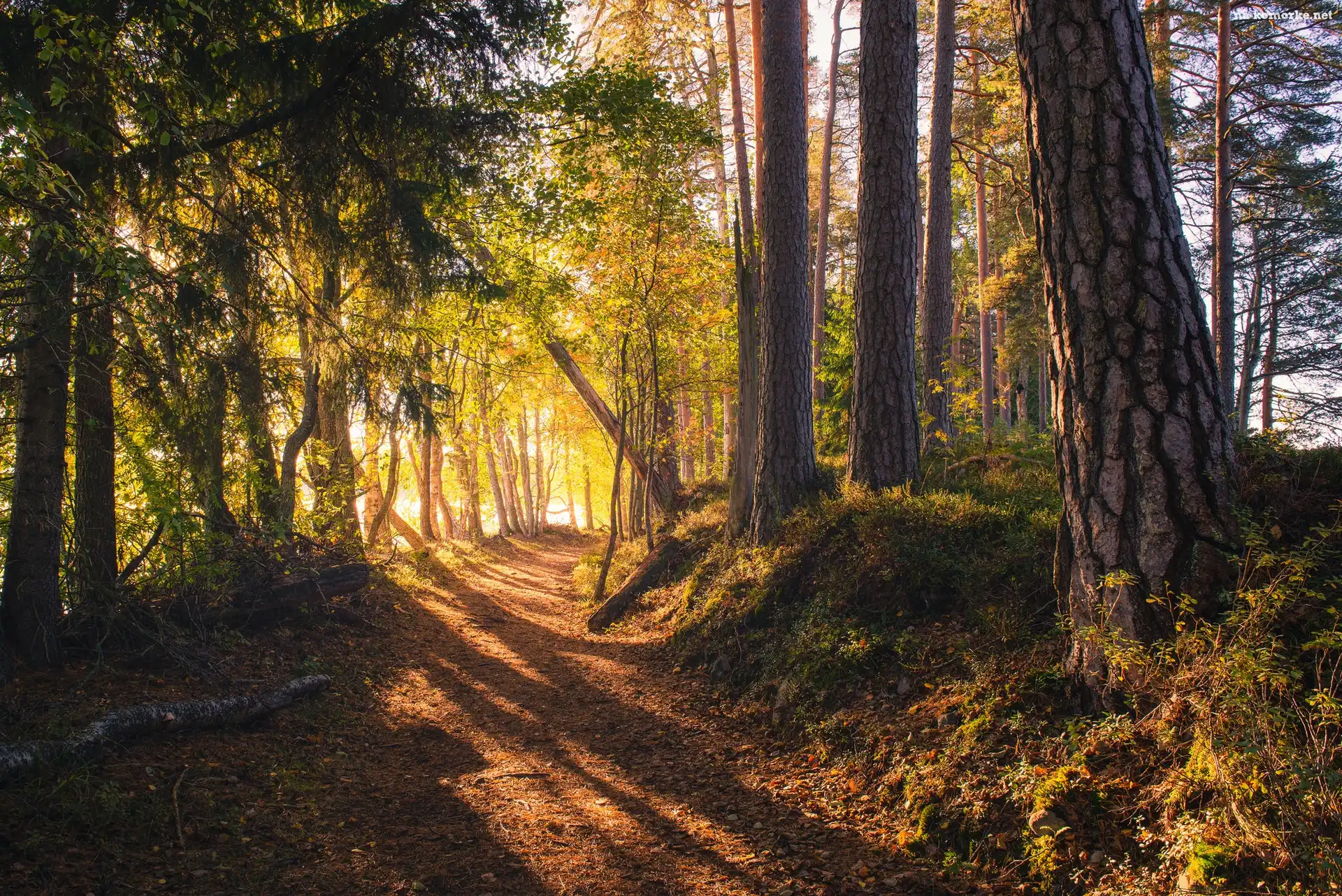 Przebijające światło, Drzewa, Las, Droga, Poranek na Komórkę