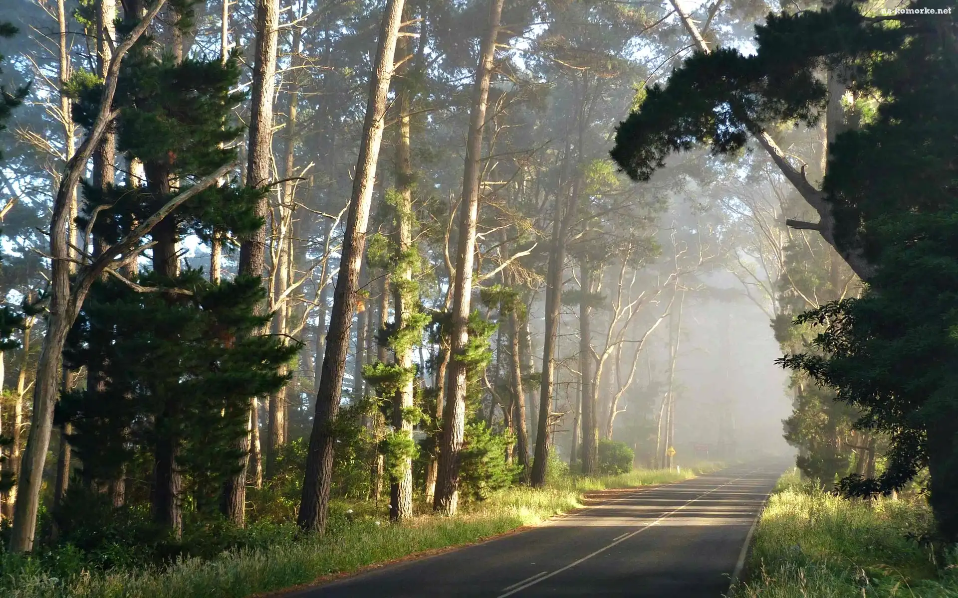 Przebijające Światło, Droga, Las, Mgła, Poranek na Komórkę