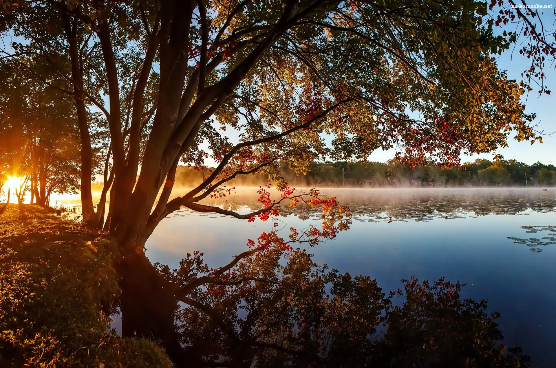 Przebijające, Las, Jezioro, Drzewa, Mgła, Światło na Komórkę