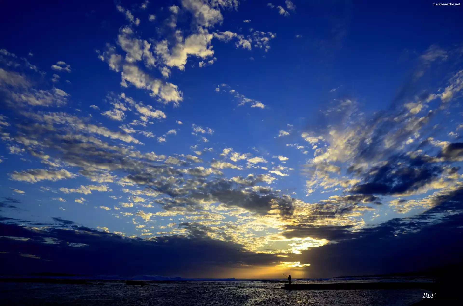 Molo, Przebijające, Światło, Wędkarz, Morze, Ciemne, Chmury na Komórkę