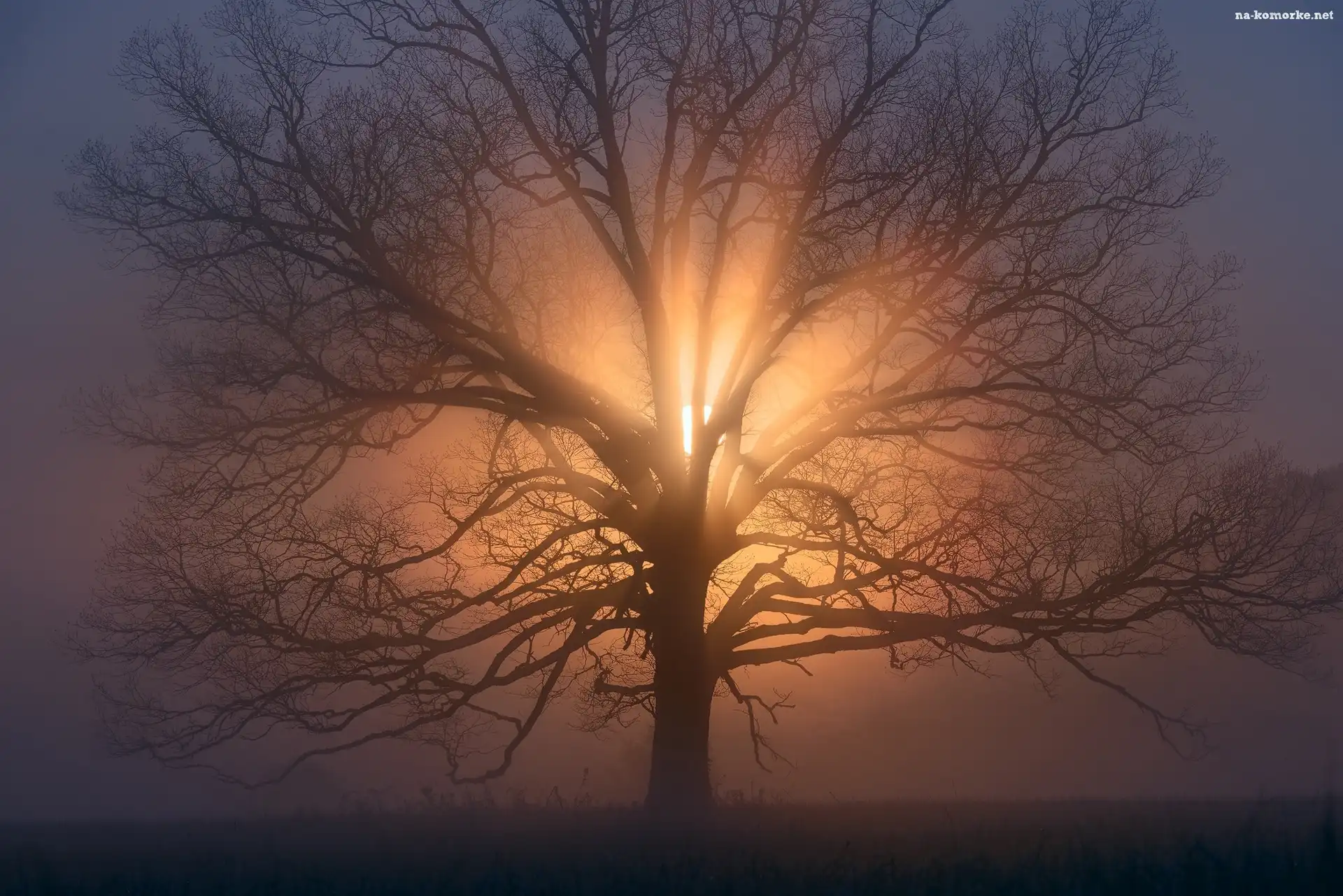 Przebijające, Zachód, Drzewo, Mgła, Słońca, Światło na Komórkę