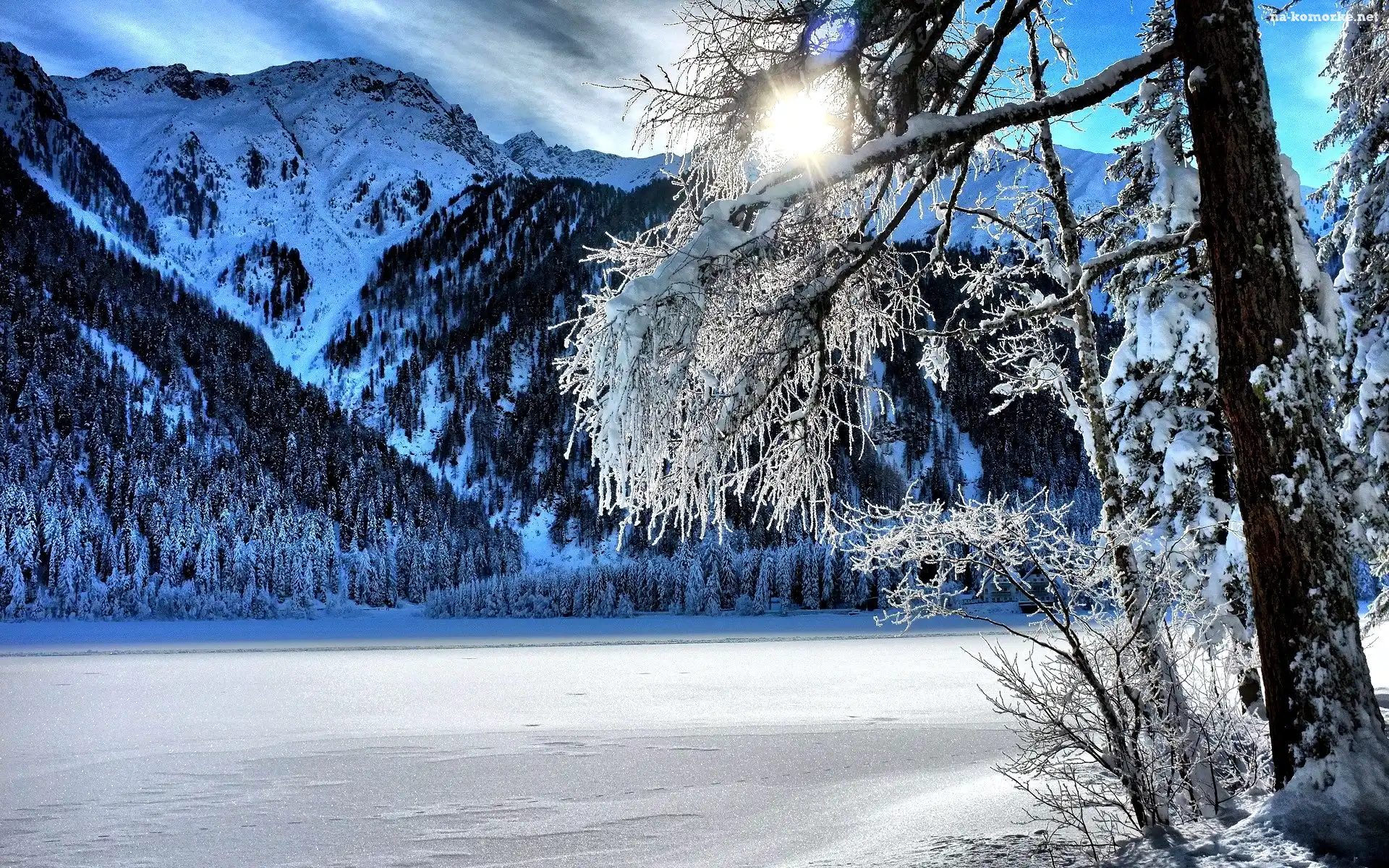 Przebijające Światło, Góry, Śnieg, Zima, Drzewo na Komórkę
