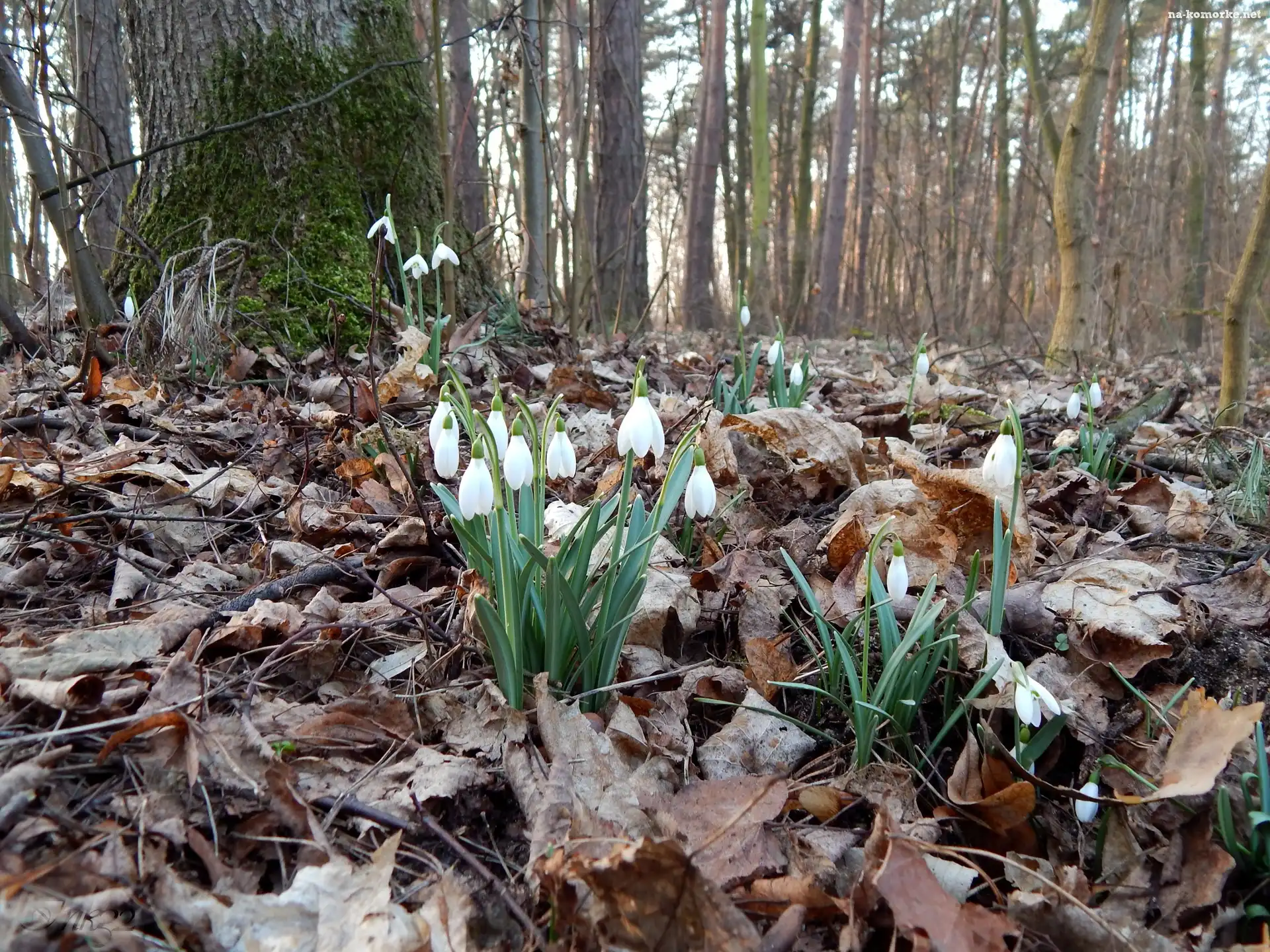 Przebiśniegi, Drzewa, Liście, Las na Komórkę