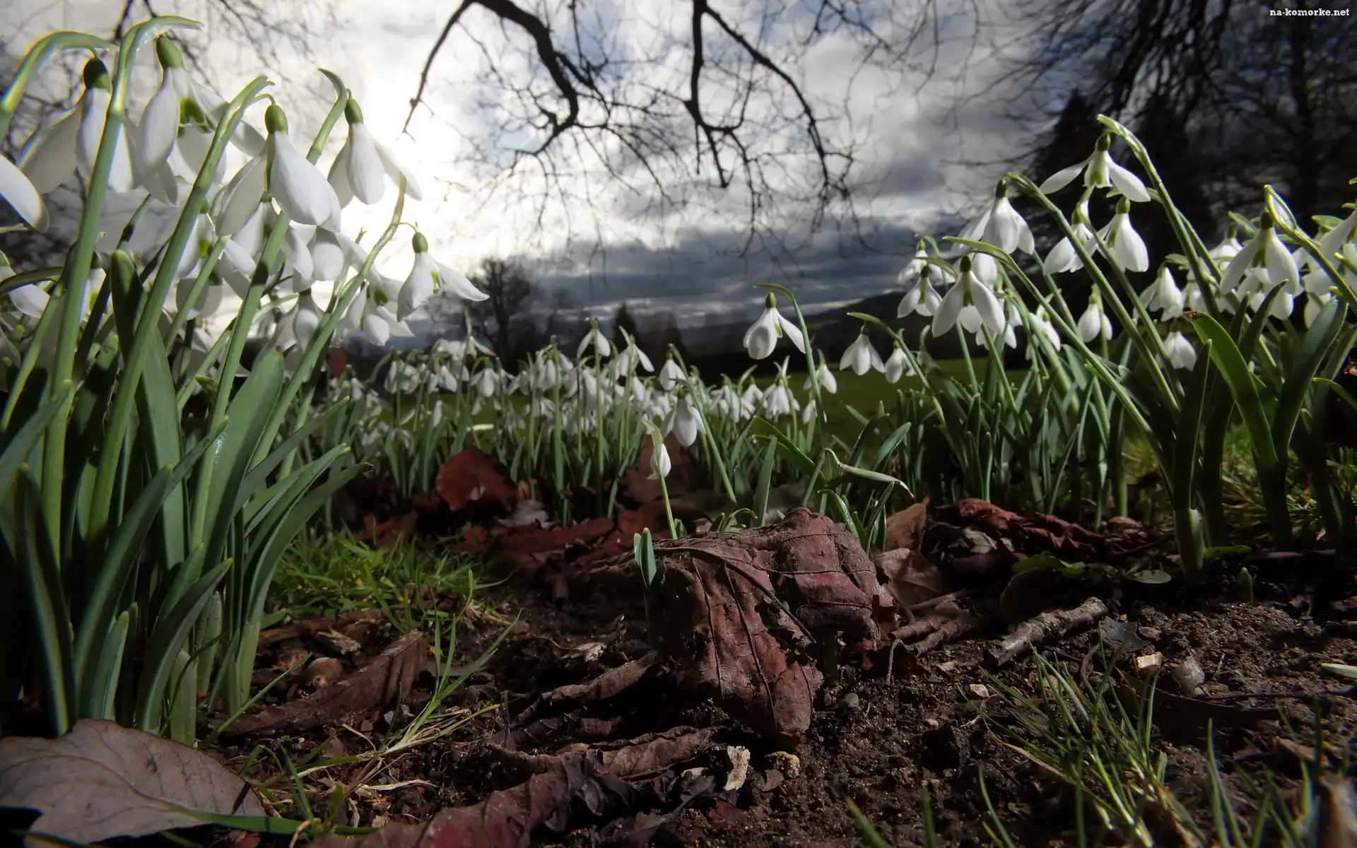 Przebiśniegi, Niebo, Liście, Gałęzie na Komórkę
