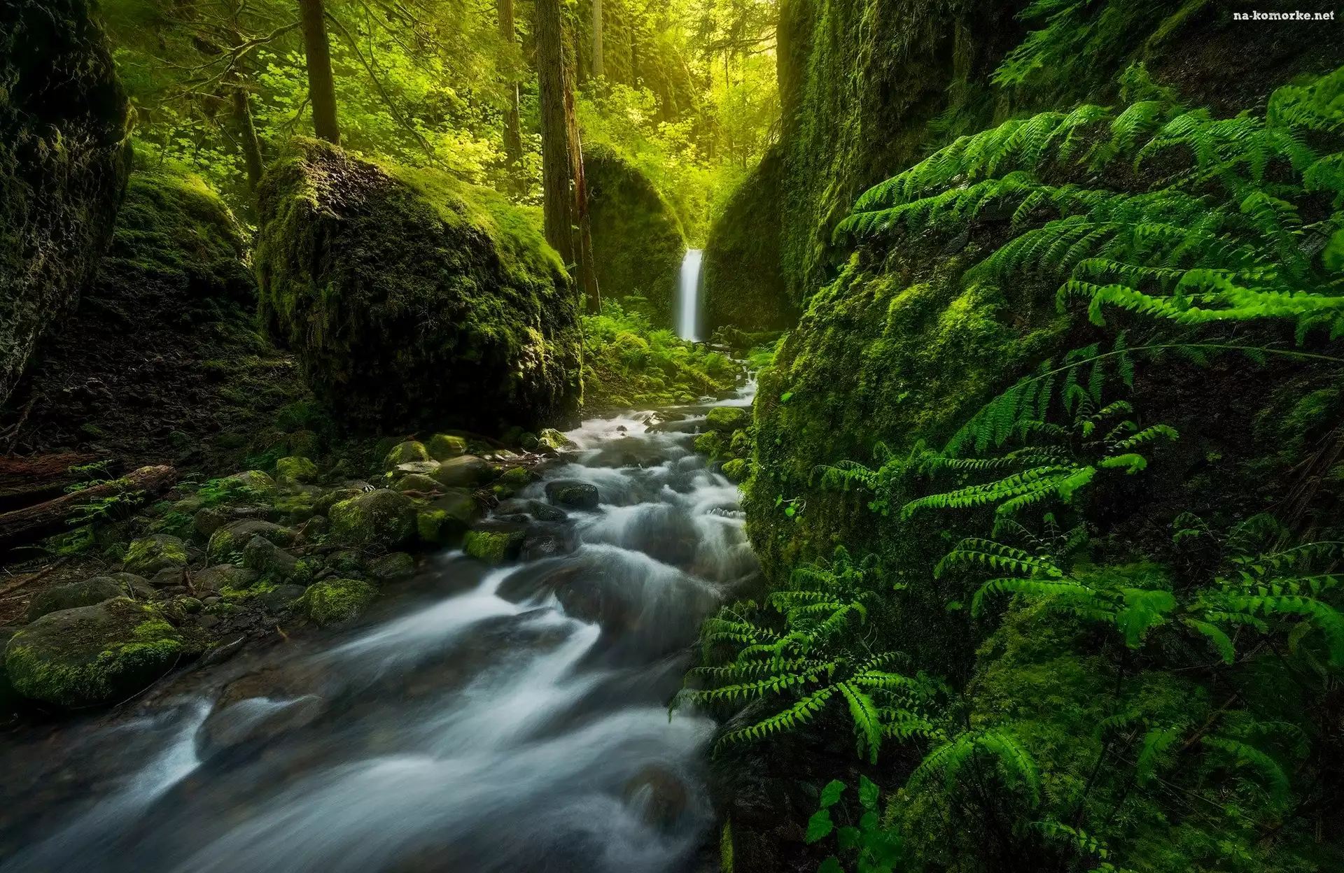 Rezerwat przyrody Columbia River Gorge, Stany Zjednoczone, Las, Rzeka Ruckel Creek, Skały, Stan Oregon, Kamienie, Wodospad Mossy Grotto Falls, Omszałe na Komórkę |