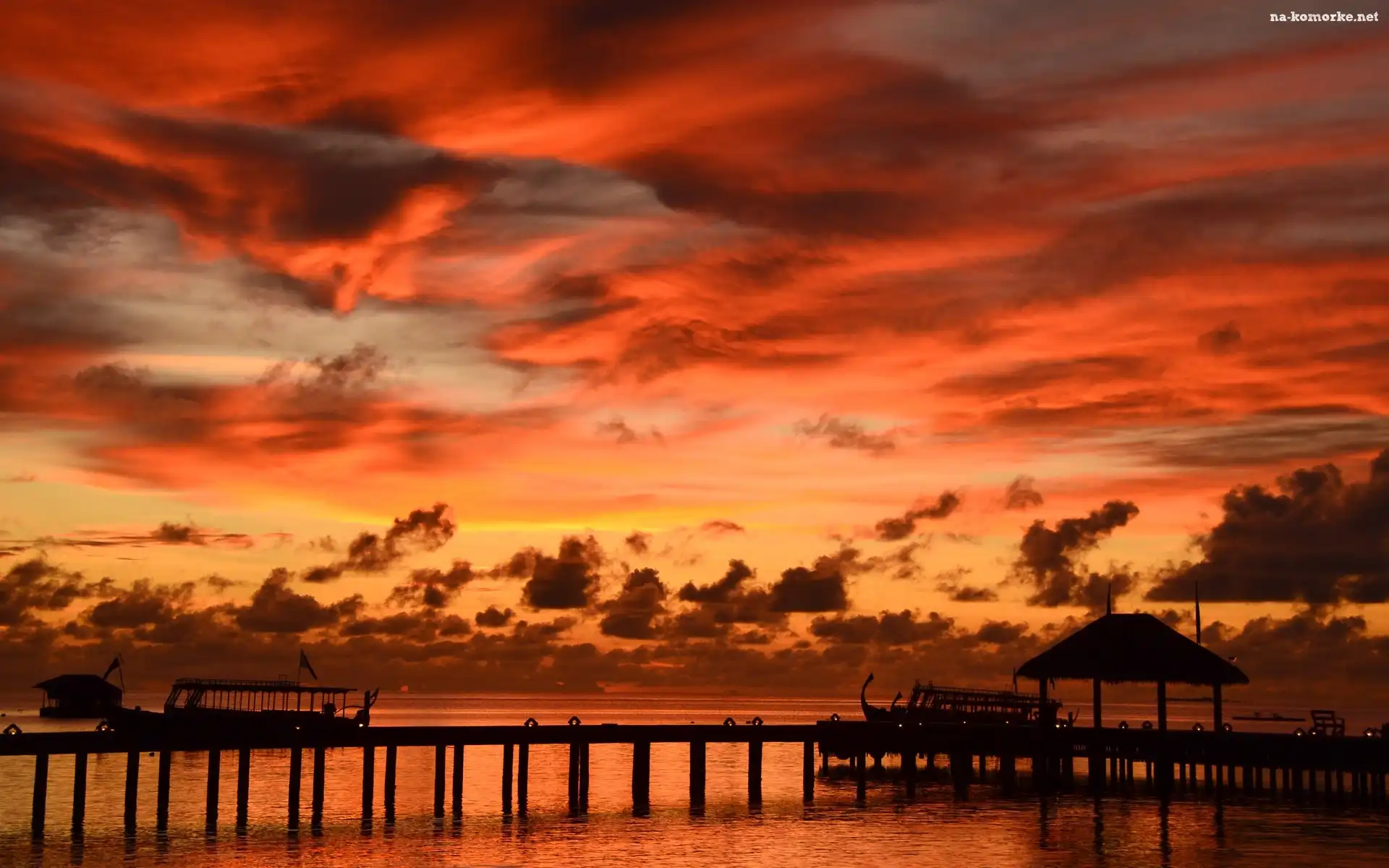 Przystań, Zachód, Słońca, Morze, Molo na Komórkę