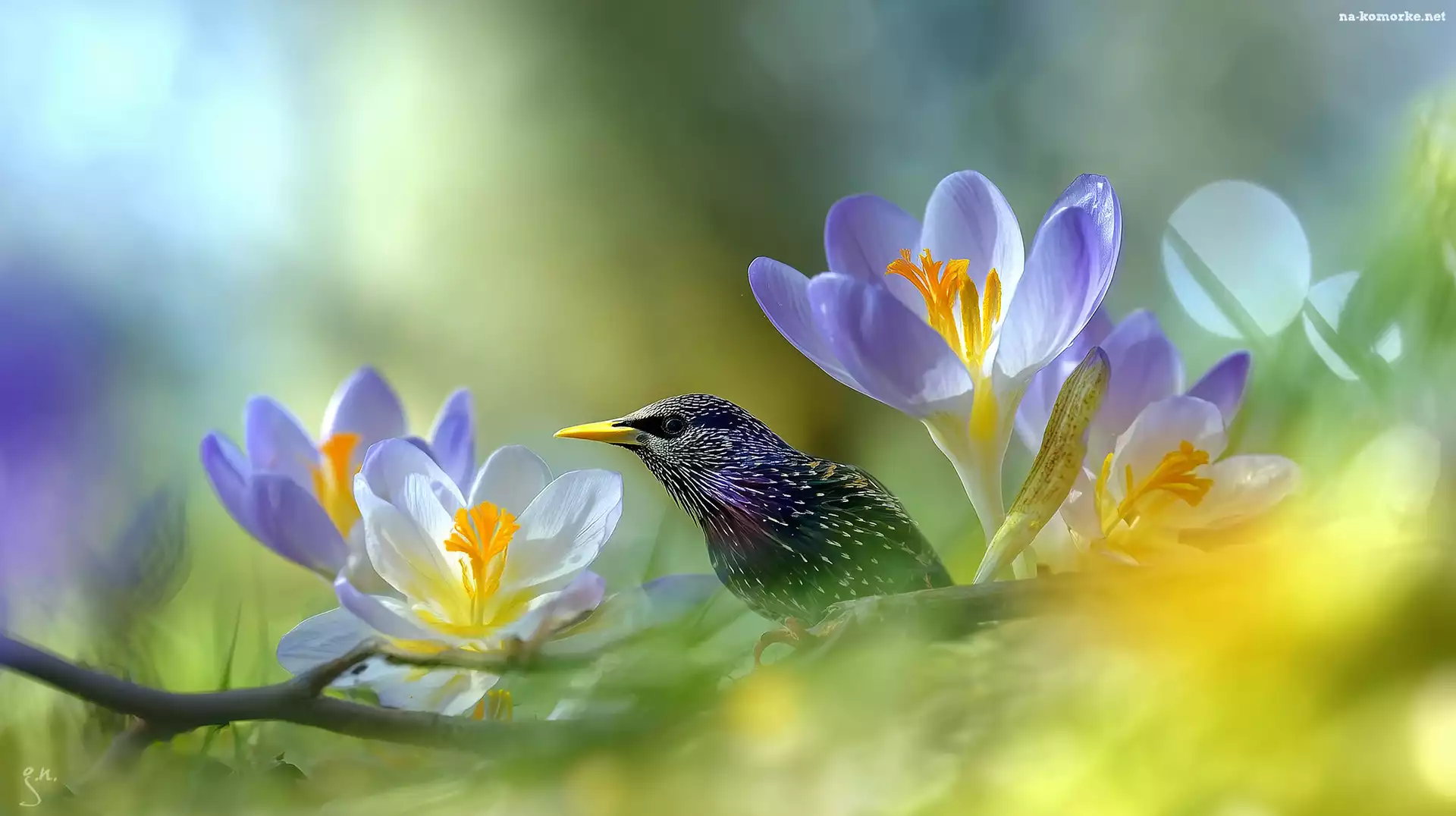 Szpak, Krokusy, Kwiaty, Ptak, Grafika AI na Komórkę