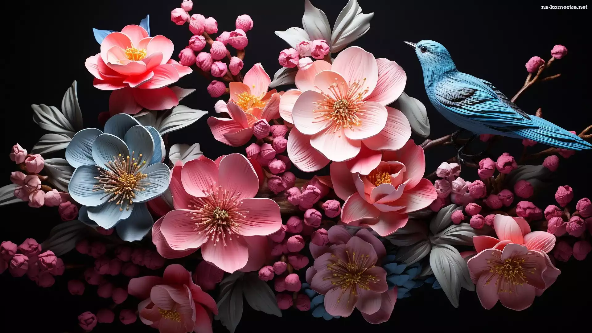Niebieski, Grafika, Kwiaty, Ptak, Niebieskie, Różowe na Komórkę