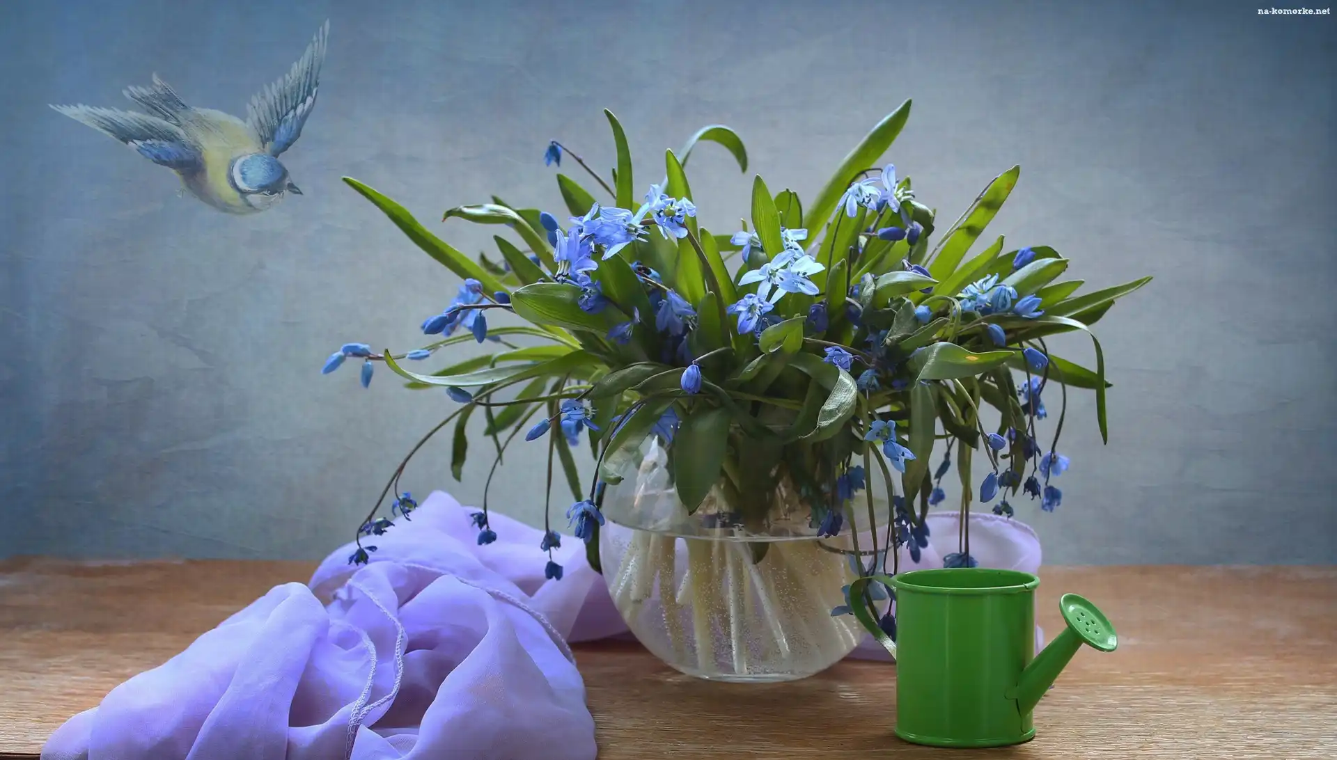 Dekoracja, Ptak, Bukiet, Cebulice Syberyjskie, Wazon, Konewka, Szal na Komórkę