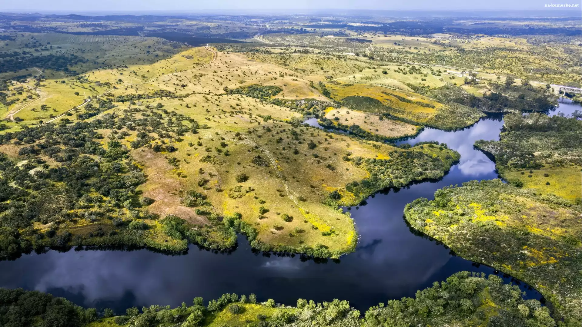 Drzewa, Z lotu ptaka, Rzeka, Wzgórza na Komórkę