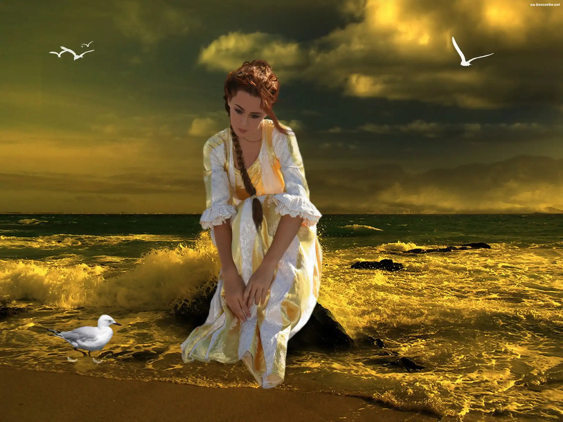 Ptaki, Kobieta, Morze, Fale, Brzeg na Komórkę