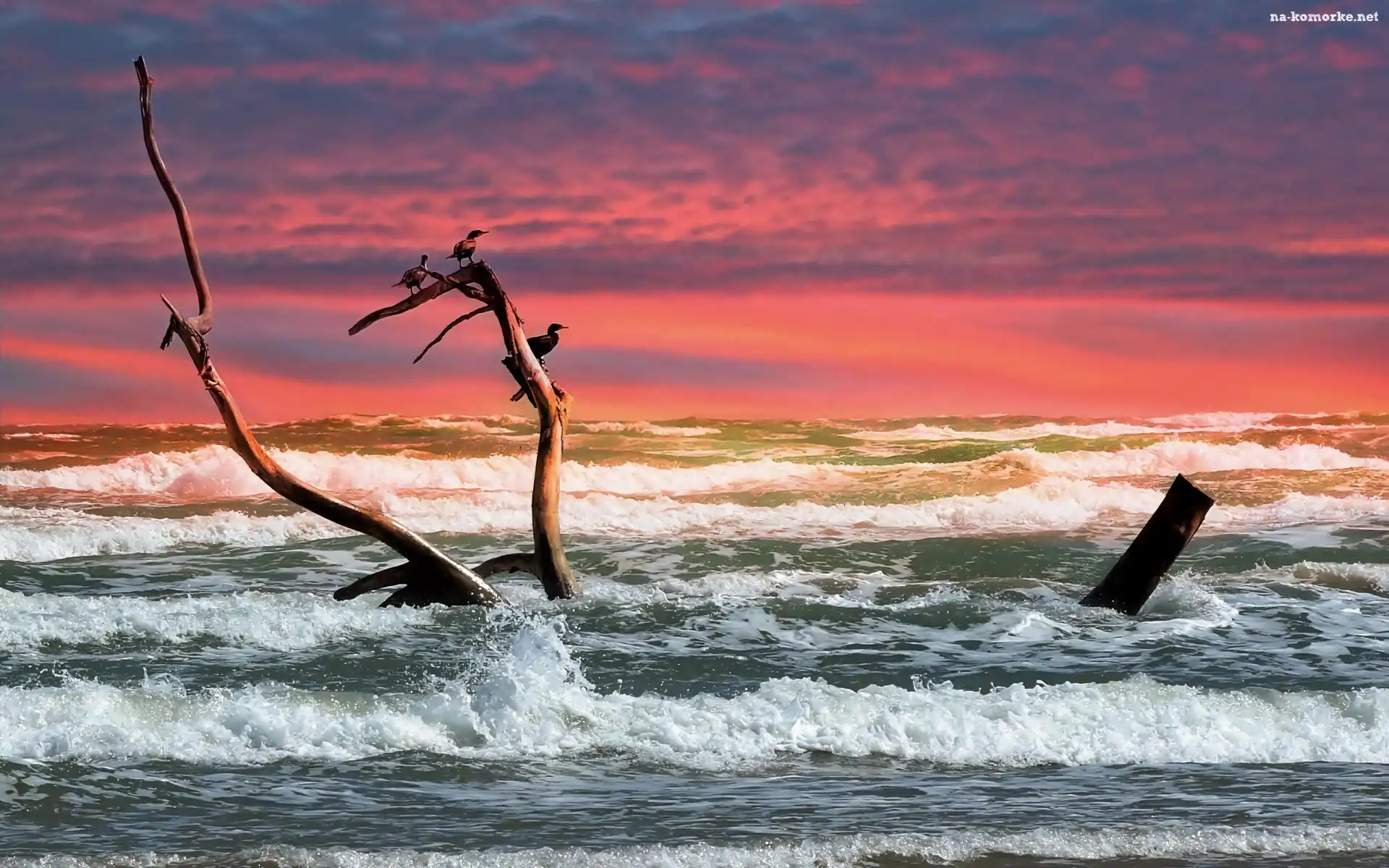 Ptaki, Fale, Ocean, Słońca, Gałąź, Wschód na Komórkę