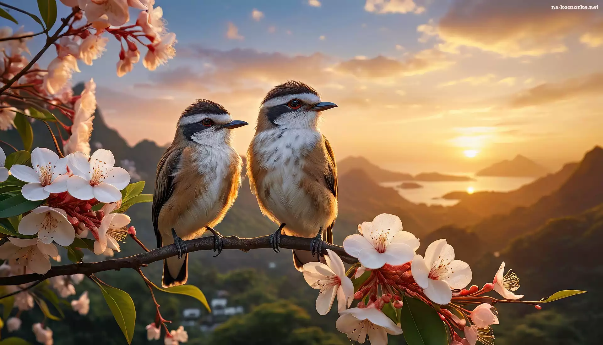 Dwa, Kwiaty, Gałązka, Ptaki, Zachód słońca na Komórkę
