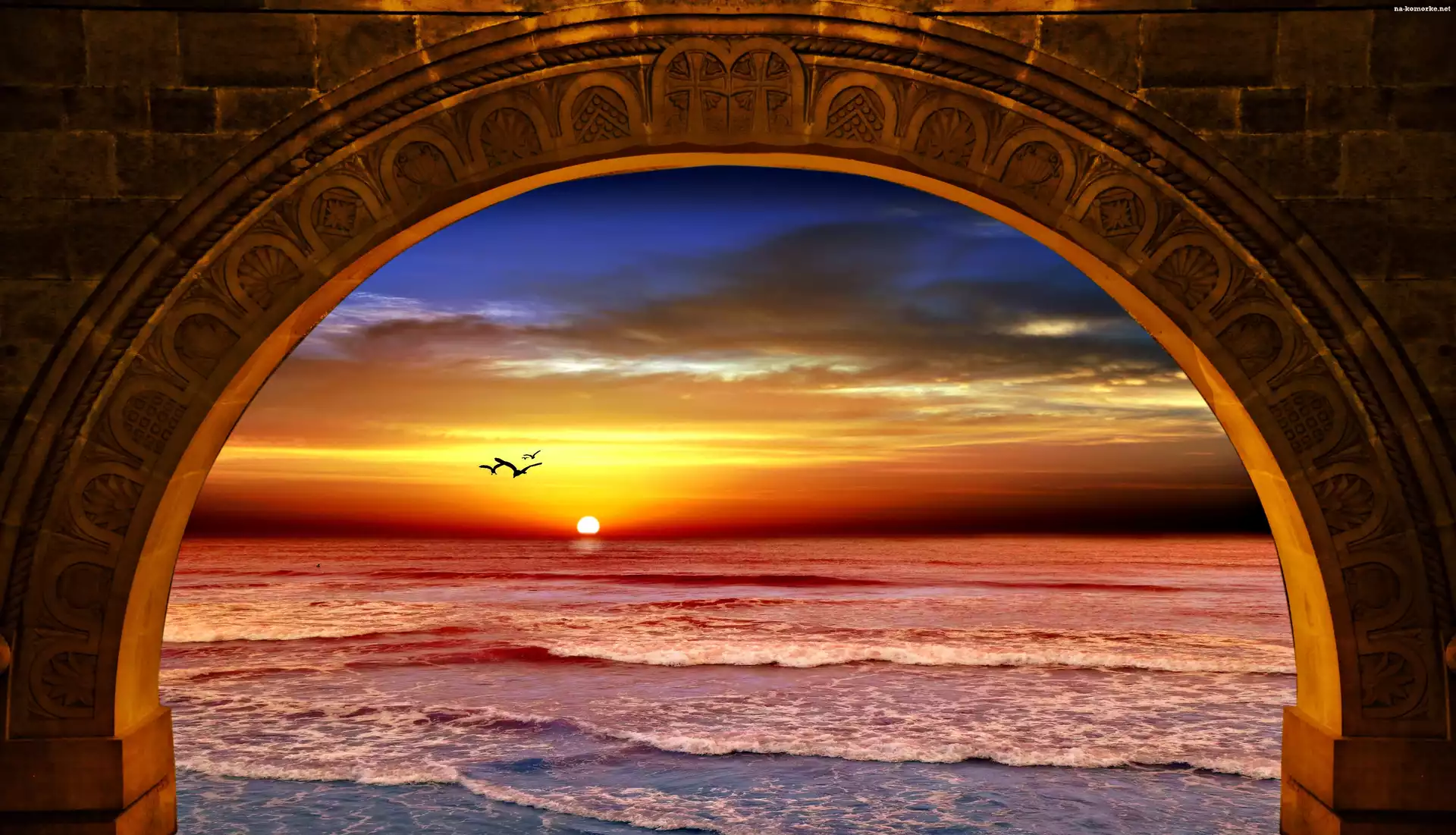 Ptaki, Łuk, Morze, Zachód, Słońca na Komórkę