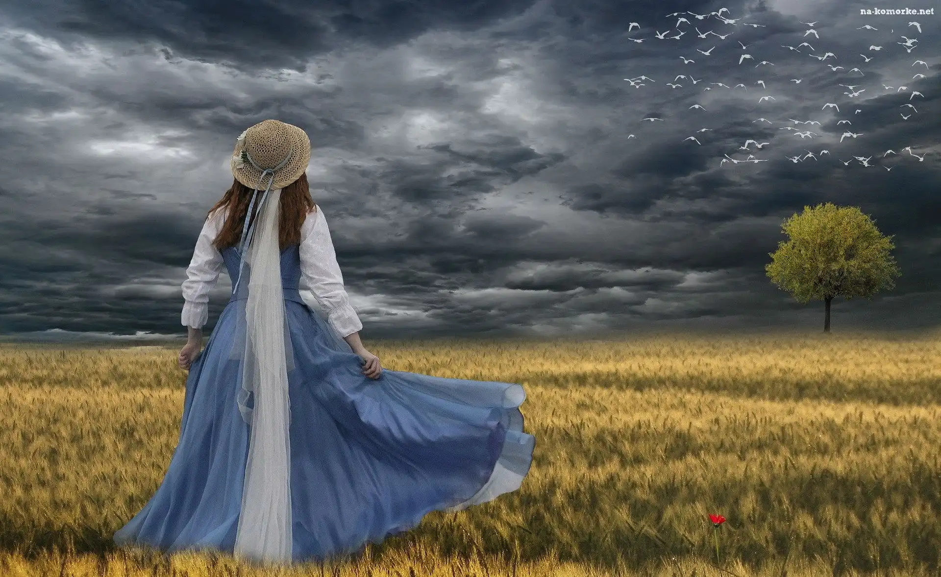 Ptaki, Pochmurne, Niebo, Zboża, Kobieta na Komórkę