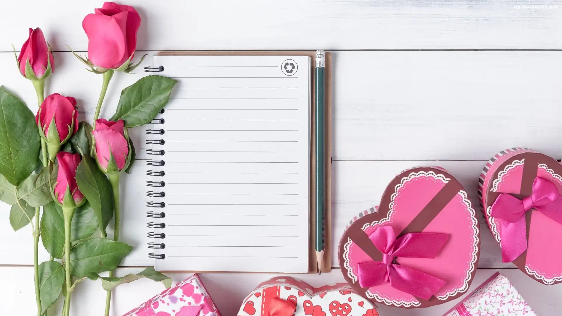 Pudełka, Notes, Róże, Deski, Ołówek, Serca na Komórkę