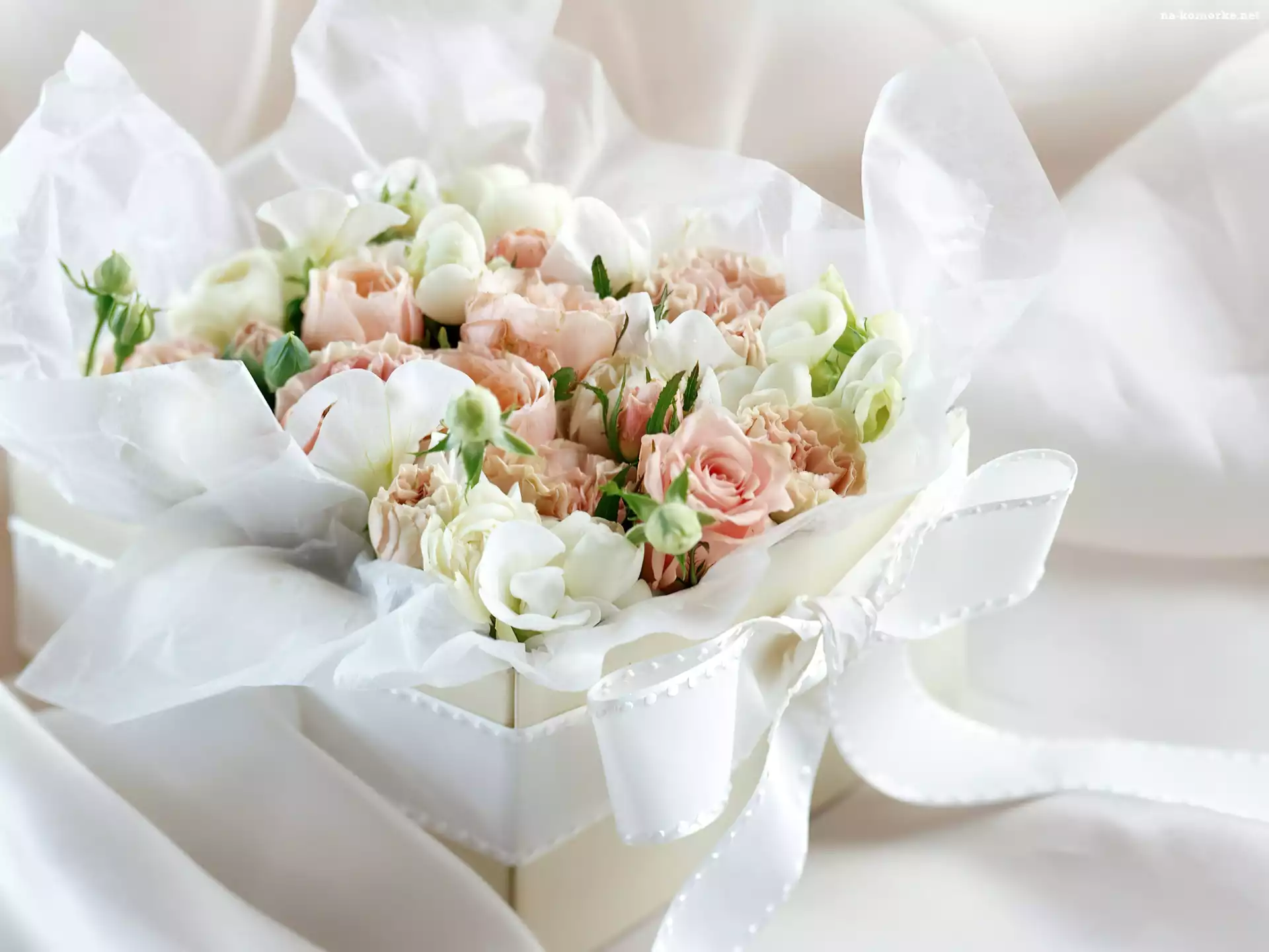 Pudełko, Bukiet, Różyczek, Biała, Wstążeczka na Komórkę