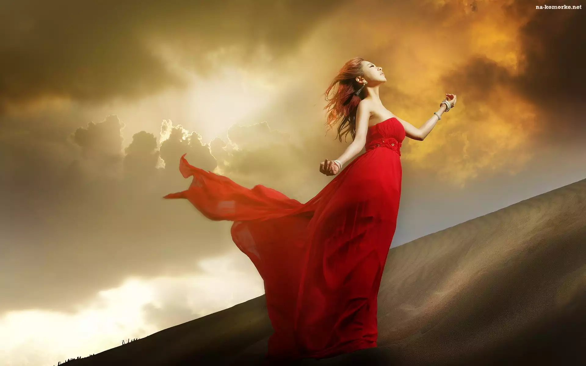 Pustynia, Czerwona, Kobieta, Chmury, Sukienka, Ciemne na Komórkę