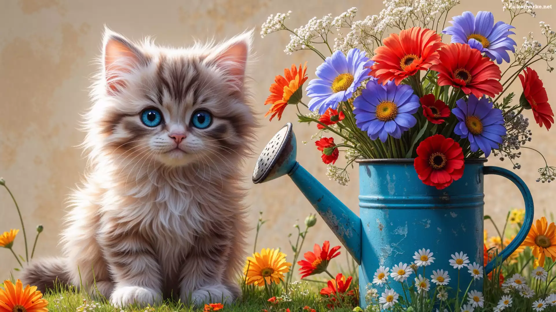 Kot, Kolorowe, Oczy, Mały, Konewka, Kwiaty, Niebieskie, Puszysty na Komórkę